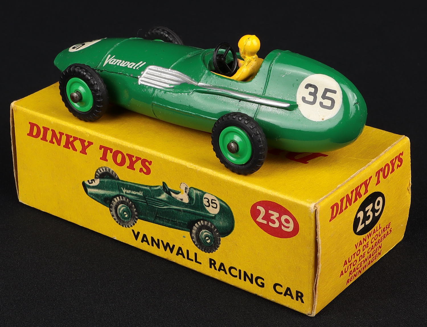 Vanwall Racing Car by Dinky Toys, No. 239. Very near mint /boxed. Rare issue with GREEN PLASTIC wheels, yellow metal driver & black PLASTIC steering wheel. Correct SMALLER DIAMETER TYRES. A First for QDT! Starting bid £200. Please note that QDT apply 12.5% buyer's commission.