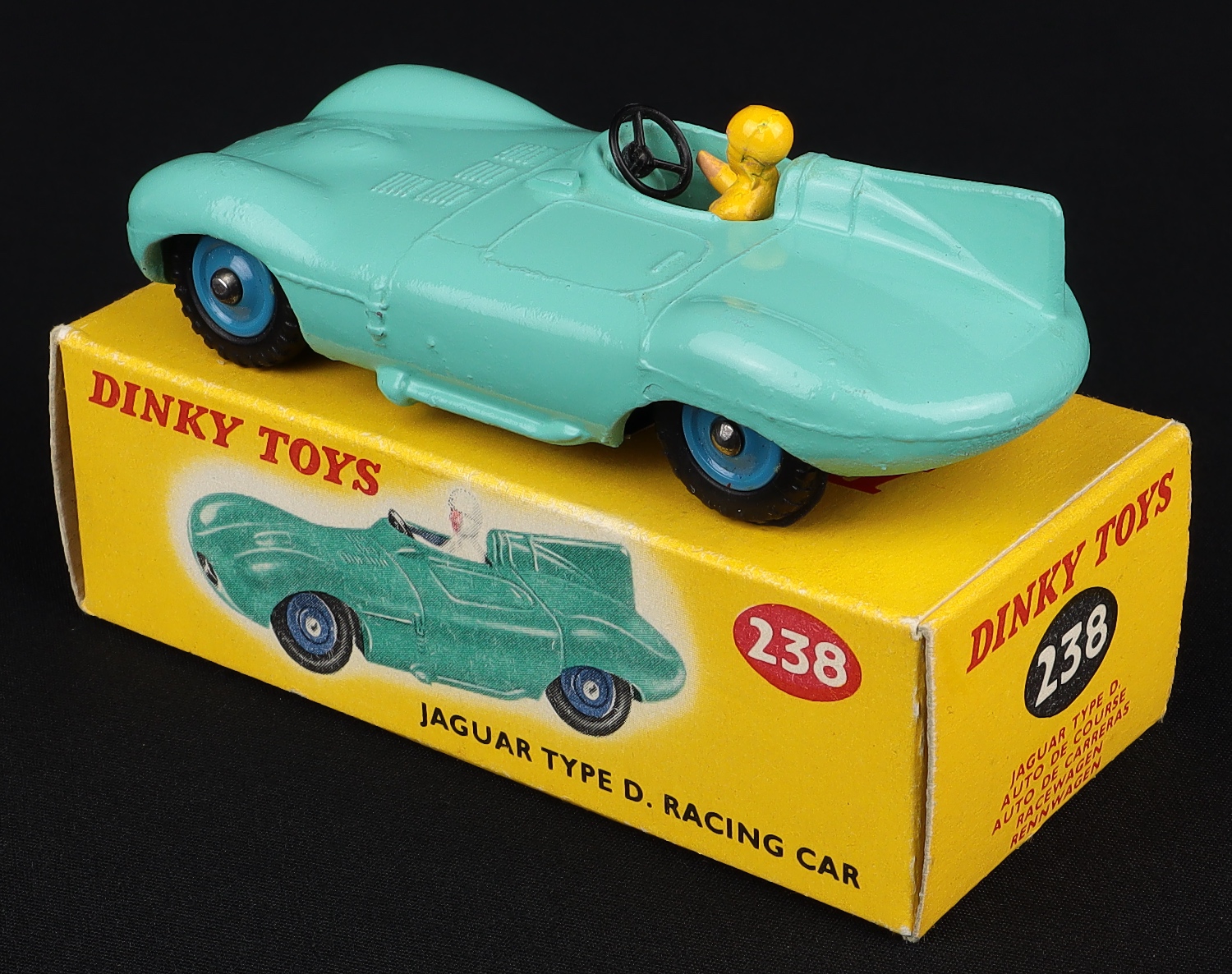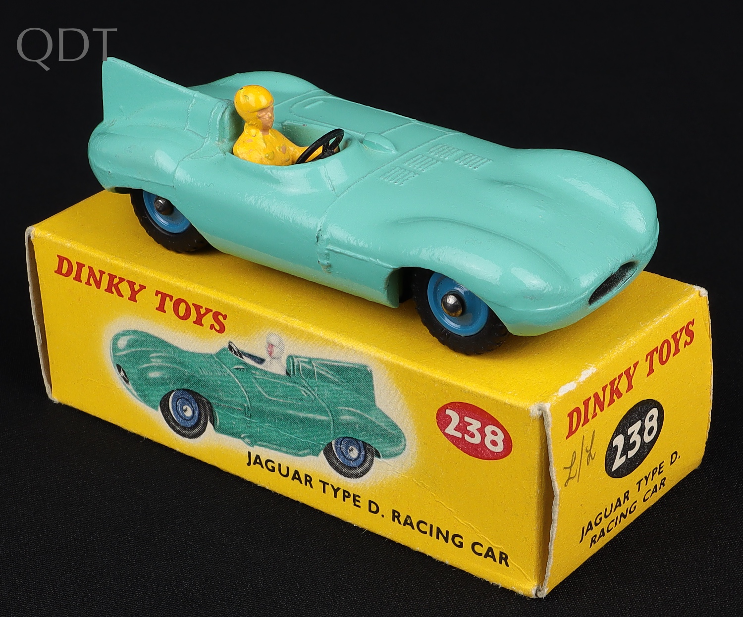 D Type Jaguar by Dinky Toys, No. 238. Very near mint /boxed. Hard to find variation with YELLOW METAL DRIVER, black plastic steering wheel, BLUE PLASTIC WHEELS! From The Rickman Collection. Starting bid £200. Please note that QDT apply 12.5% buyer's commission.