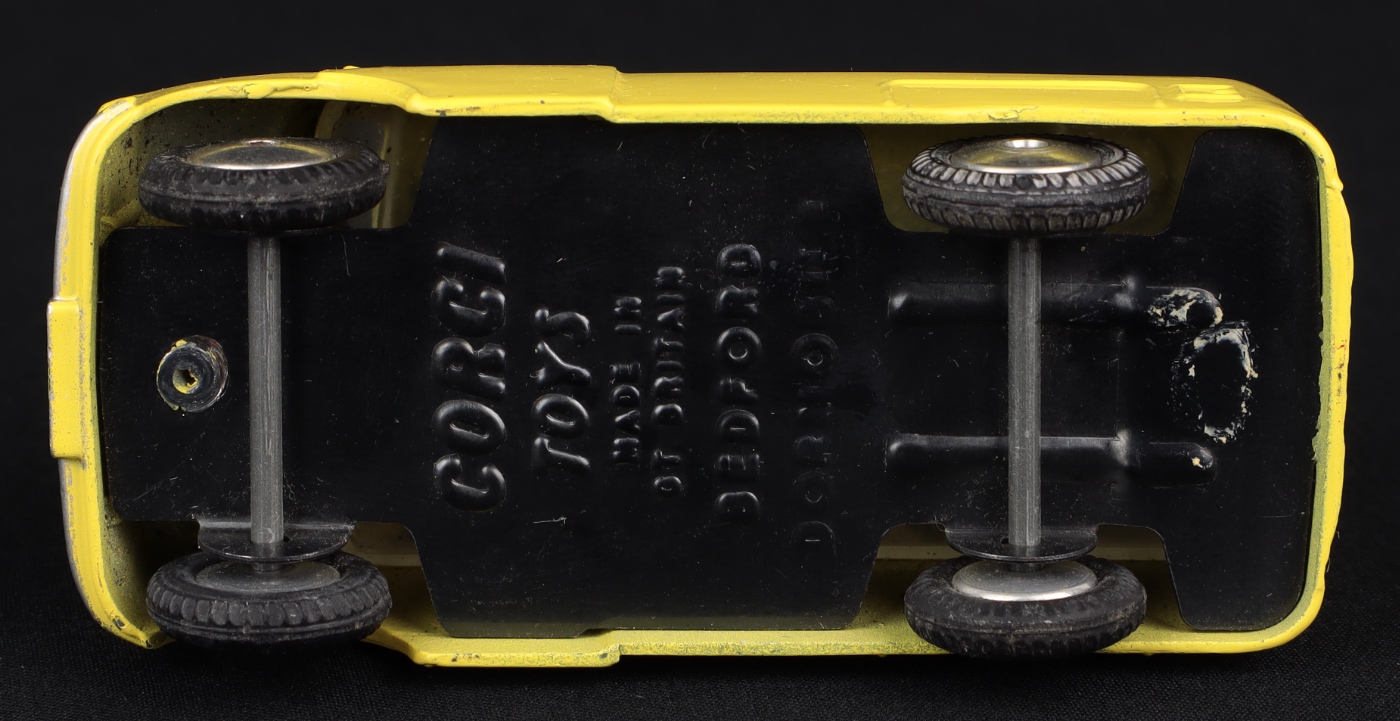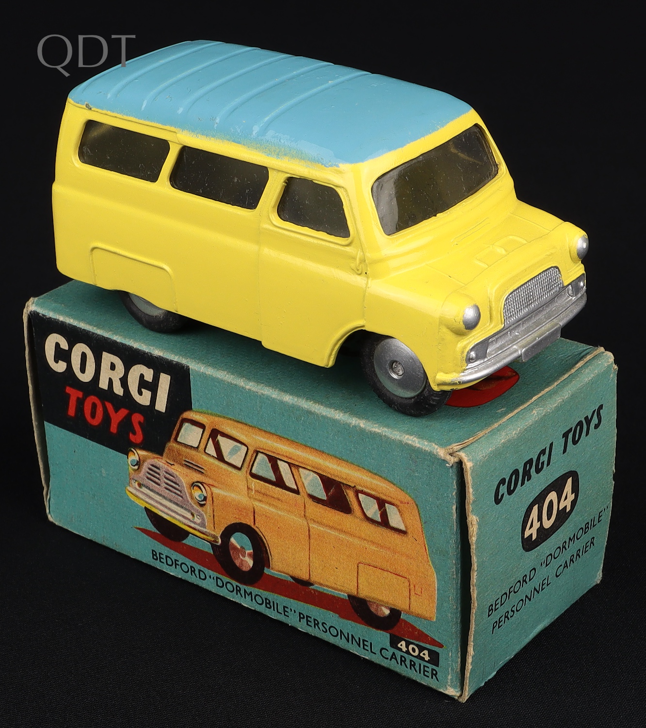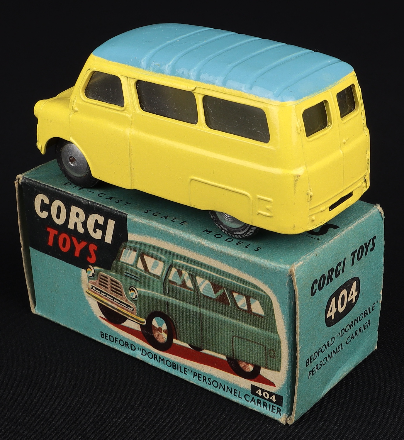 Bedford "Dormobile" Personnel Carrier by Corgi Toys, No. 404. Lemon, blue ridged roof, undivided screen & FLAT spun hubs. Very near mint/boxed. Scarce issue.