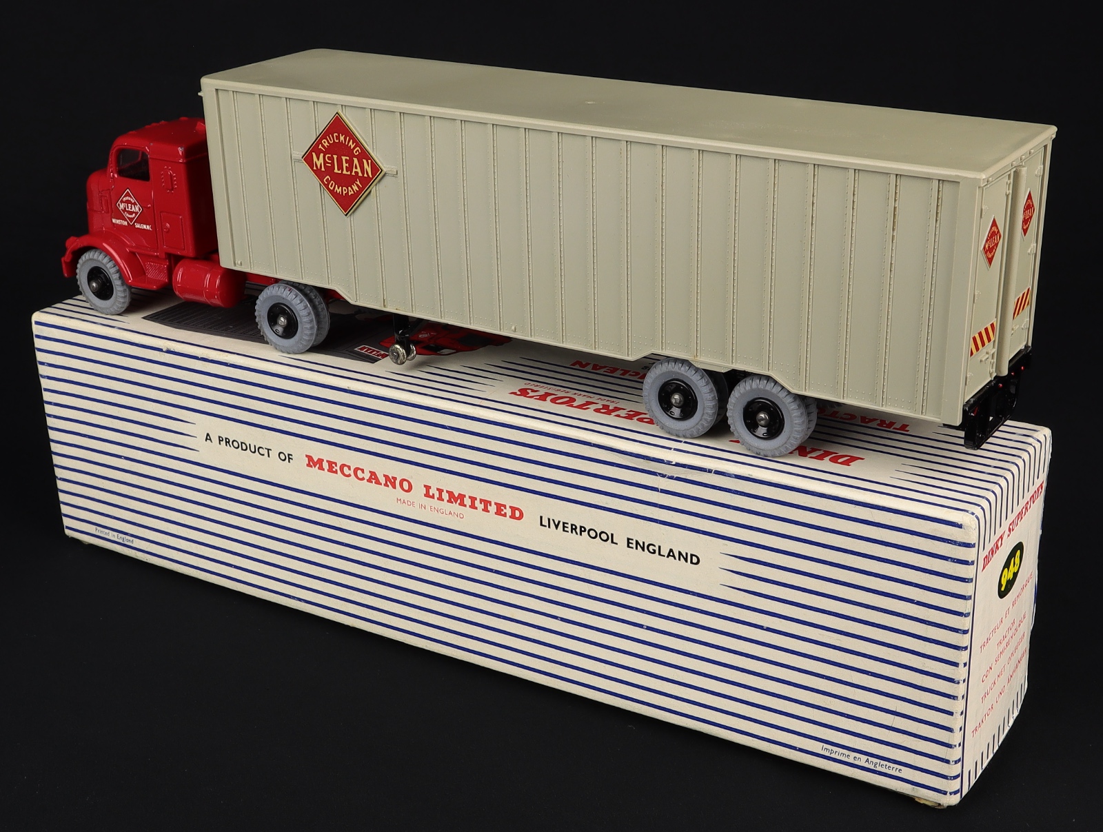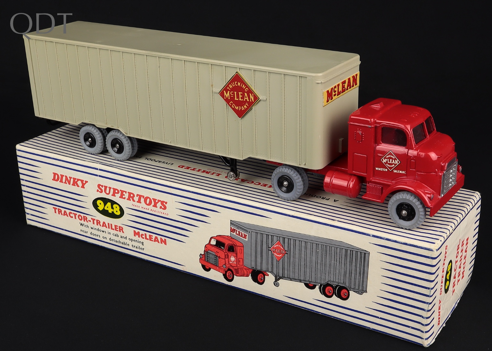 Tractor-Trailer 'McLean Trucking Company' by Dinky Supertoys, No. 948. Red & grey issue. Rare to find with BLACK WHEELS. Yellow box base. . Near mint plus/boxed. From The Reference Collection. Starting bid £250. Please note that QDT apply 12.5% buyer's commission.
