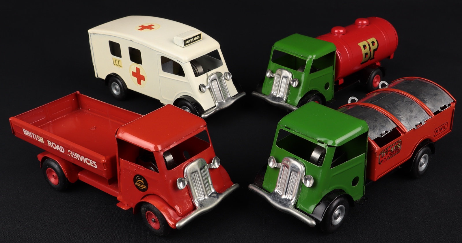 6) British Road Services Truck is in deep red (tinplate) with shiny chrome fitting and red wheel. Well-shaped balloon tyres. Near complete ‘BRITISH ROAD SERVICES’ lettering on both sides. Complete logo on both cab sides. Working clockwork motor. Very near mint.