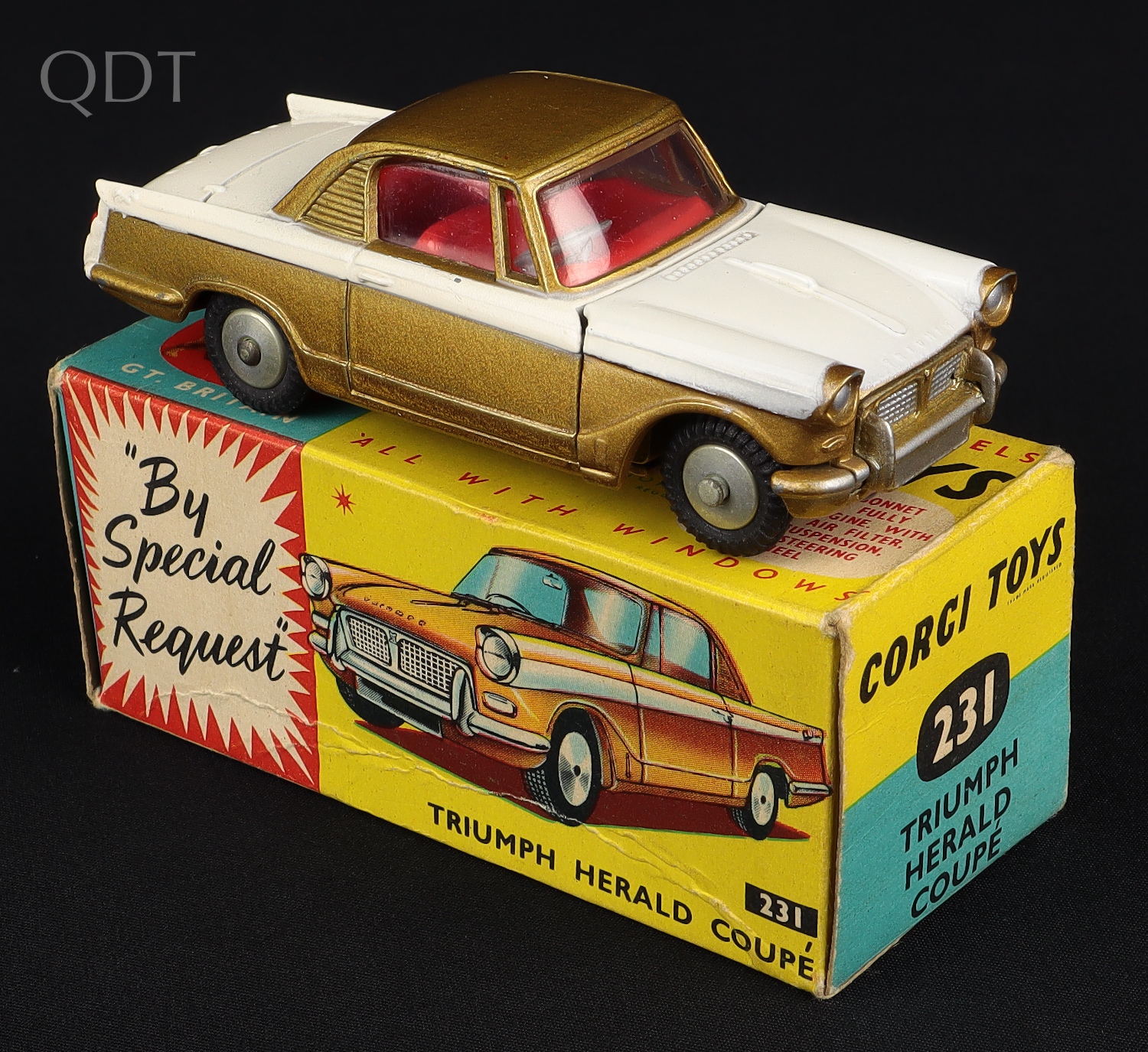 Triumph Herald Coupe by Corgi Toys, No. 231. Very near mint /boxed. Gold and white version. With air filter. From The Elmer Collection.