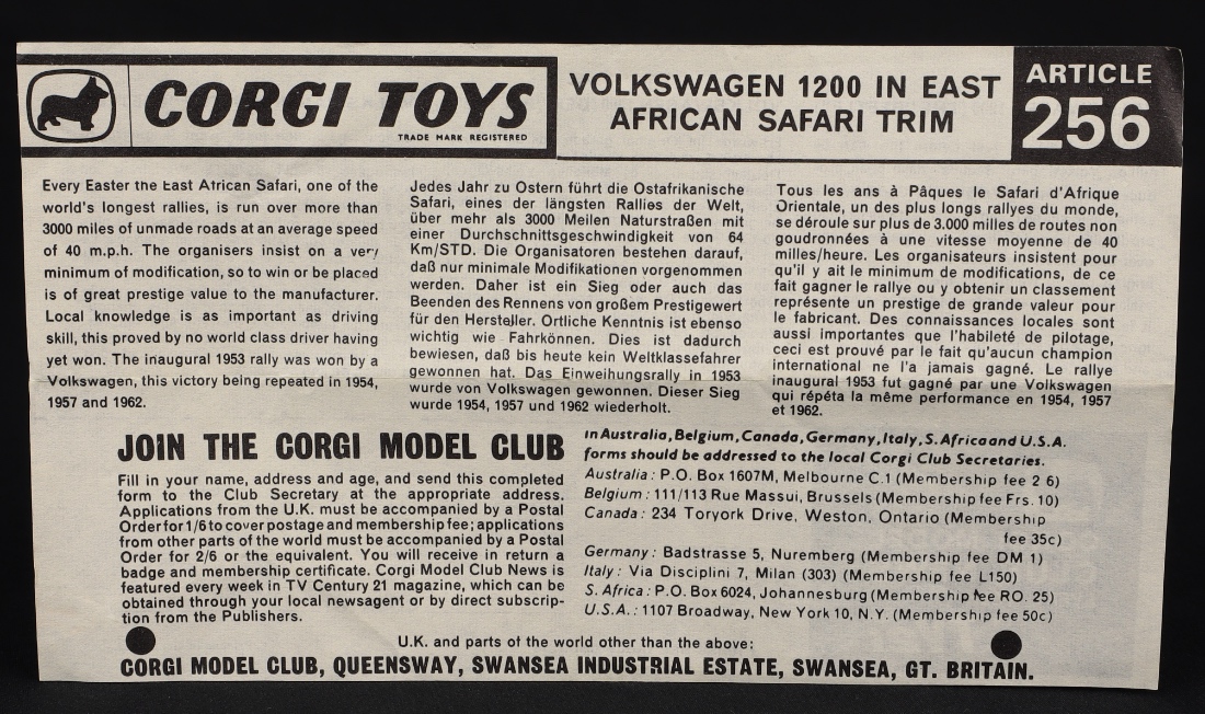 Volkswagen 1200 in East African Safari Trim with Rhino by Corgi Toys, No. 256. Very, very near mint/boxed. Left-hand drive. With all packing, leaflet & version with FULL circular card ring. From The Elmer Collection.