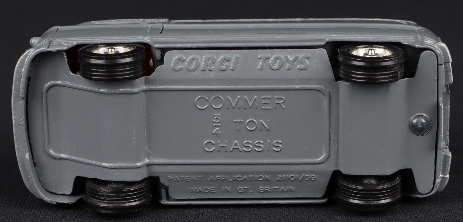 This Commer Van model is based on the standard Corgi 462 model. This example is in mint condition with a distinctive original grey finish, red interior and silver dished wheels, rivetted base (found with either riveted or screwed bases, in our experience).