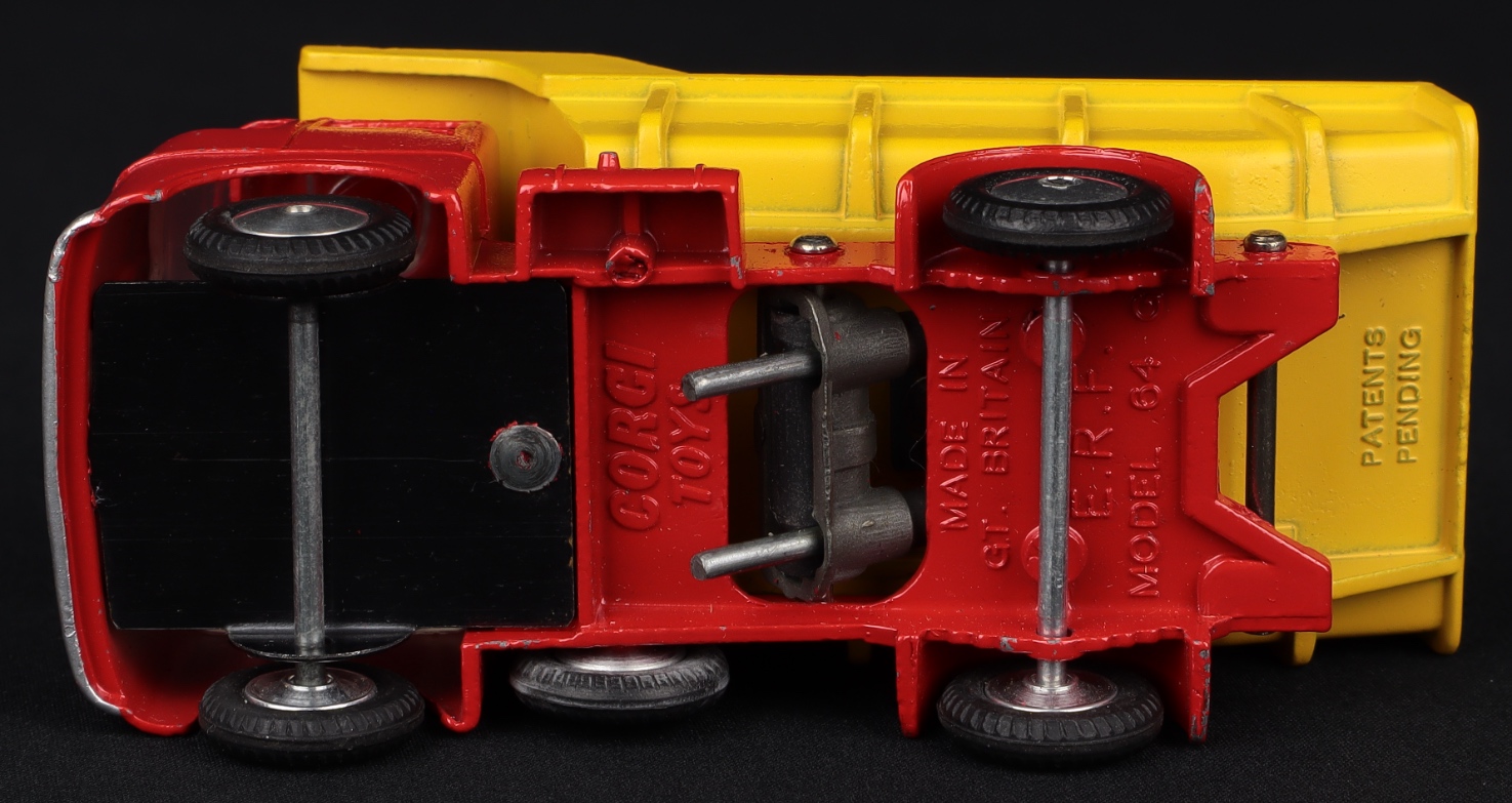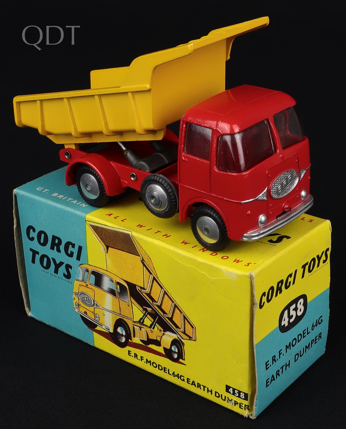 ERF Earth Dumper by Corgi Toys, No. 458. Flat spun wheels issue & MATTE yellow back. Very near mint/boxed.