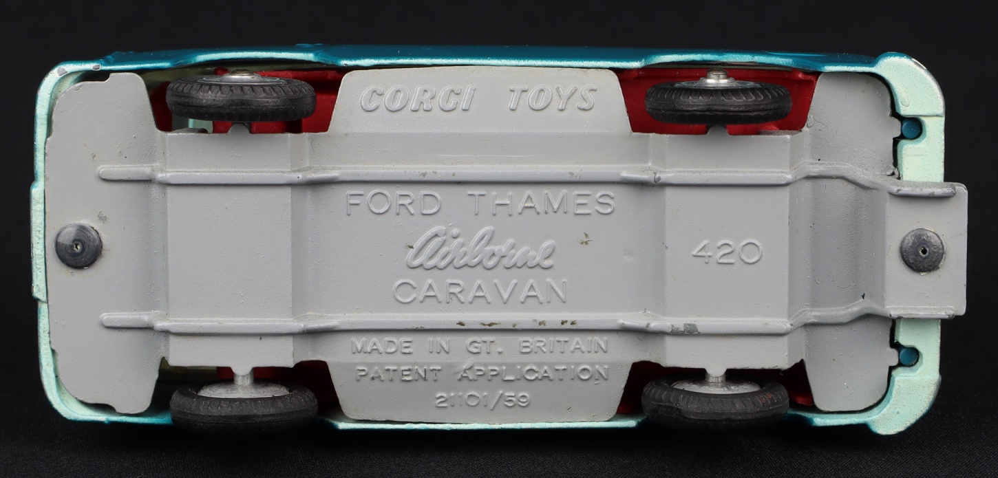 Ford Thames Airborne Caravan by Corgi Toys, No. 420. Teal and very pale blue issue, with red interior. Very near mint/boxed. From The Rickman Collection.