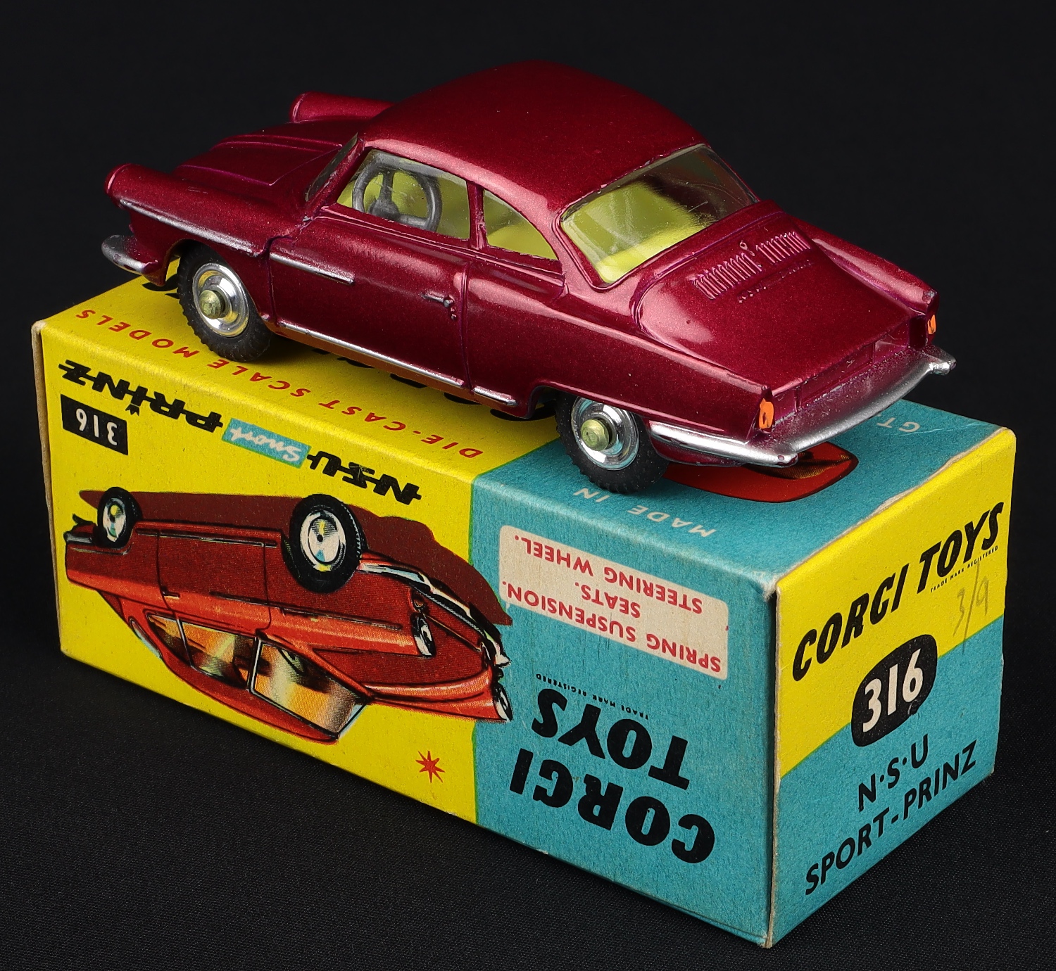 NSU Sport Prinz by Corgi Toys 316. DEEP cerise issue. Very near mint/boxed. Crisp box! From The Elmer Collection.