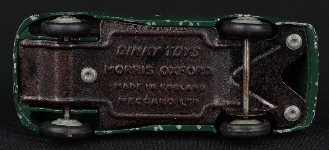 A striking very dark bottle green paint finish on this Dinky Morris Oxford Saloon car with 1st type baseplate (small print and chassis rails). Grey wheels.