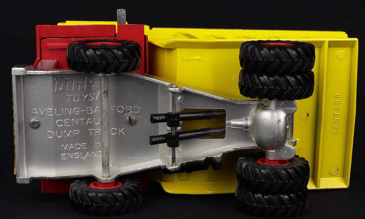 Aveling Barford Centaur Dump Truck by Dinky Toys, No. 924. Lighter YELLOW & RED issue. RED PLASTIC wheels. Very, very near mint/boxed.
