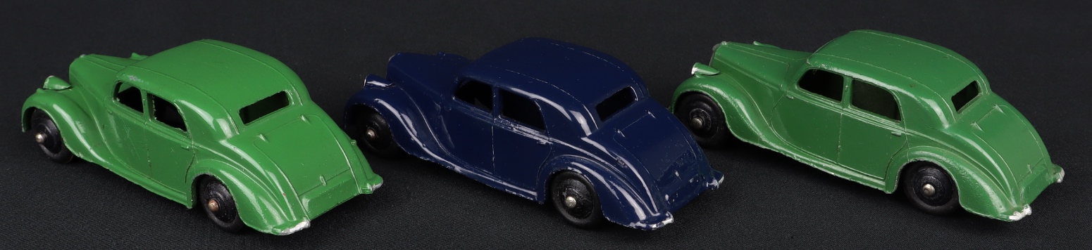 3 x Riley Saloons by Dinky Toys, No. 40A. Very scarce issue in MIDNIGHT BLUE. Also mid-green & deep green versions . Near mint plus - very near mint/not boxed individually. From The Reference Collection. Starting bid £150. Please note that QDT apply 12.5% buyer's commission.