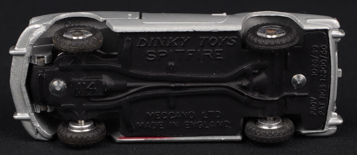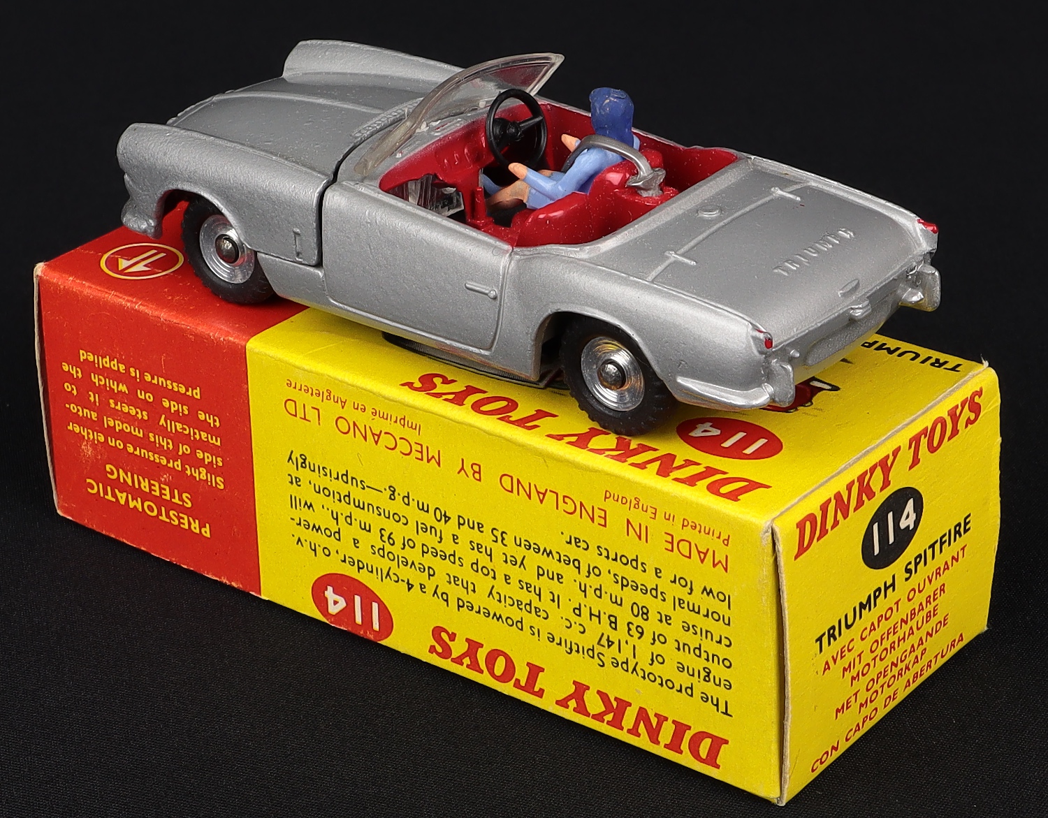 Triumph Spitfire by Dinky Toys, No. 114. Silver version with BRIGHT RED SEATING & version with CUT-AWAY DASHBOARD CASTING. Very, very near mint/boxed, with card packing ring. From The Reference Collection.