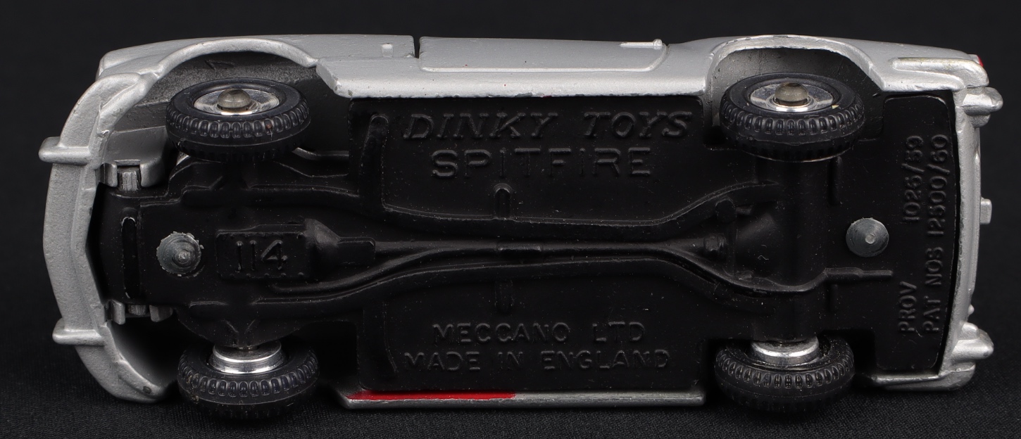 Triumph Spitfire by Dinky Toys, No. 114. Silver version with BRIGHT RED SEATING & version with CUT-AWAY DASHBOARD CASTING. Very near mint/boxed. From The Rickman Collection.