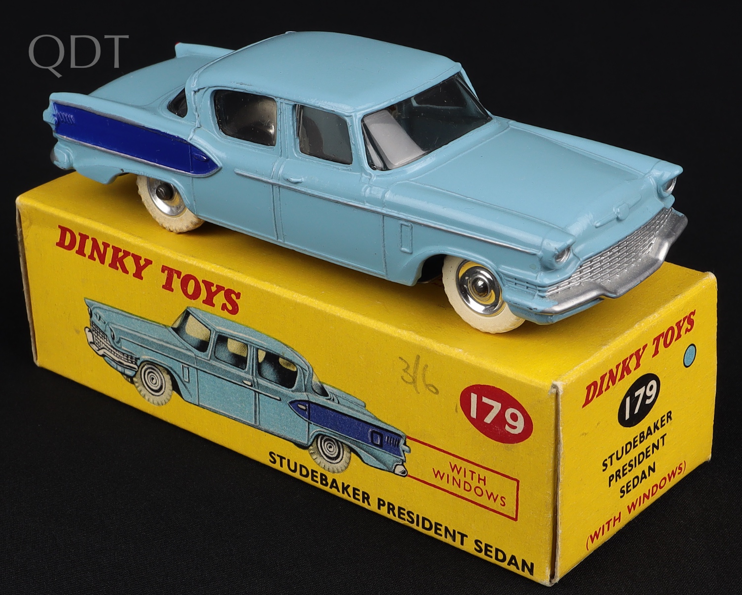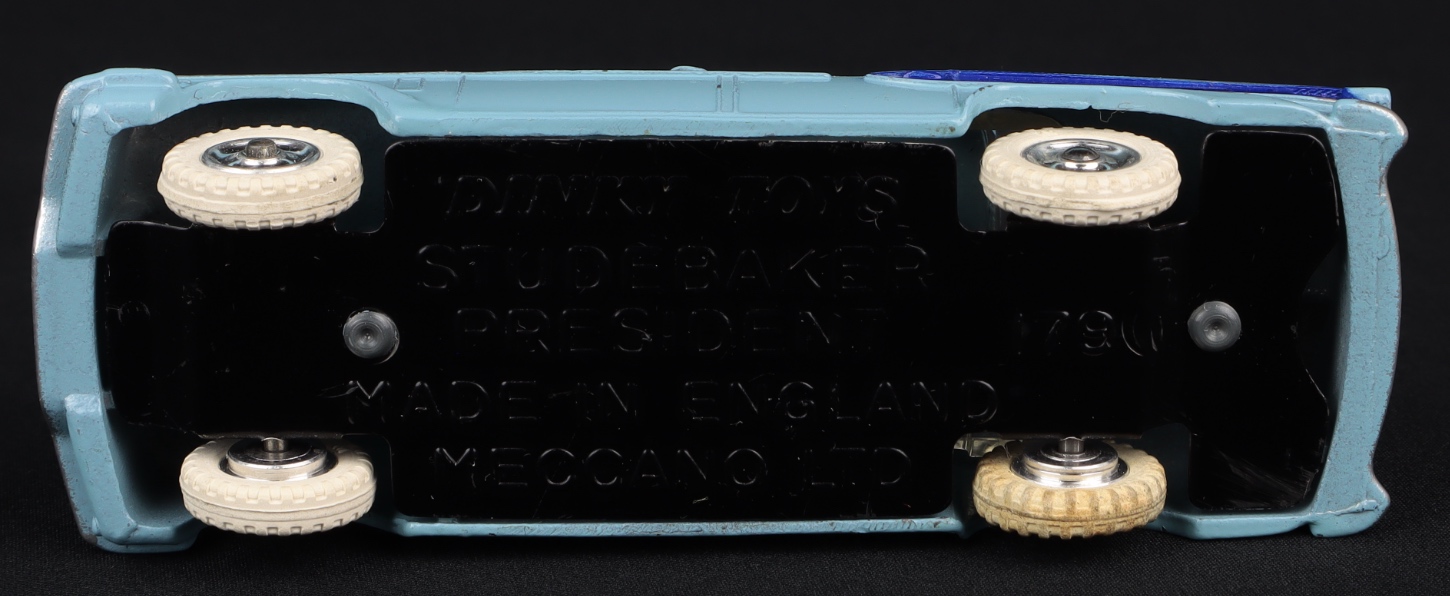 Studebaker President Sedan by Dinky Toys, No. 179. Two-tone blue issue. Very, very near mint/boxed. From The Rickman Collection.