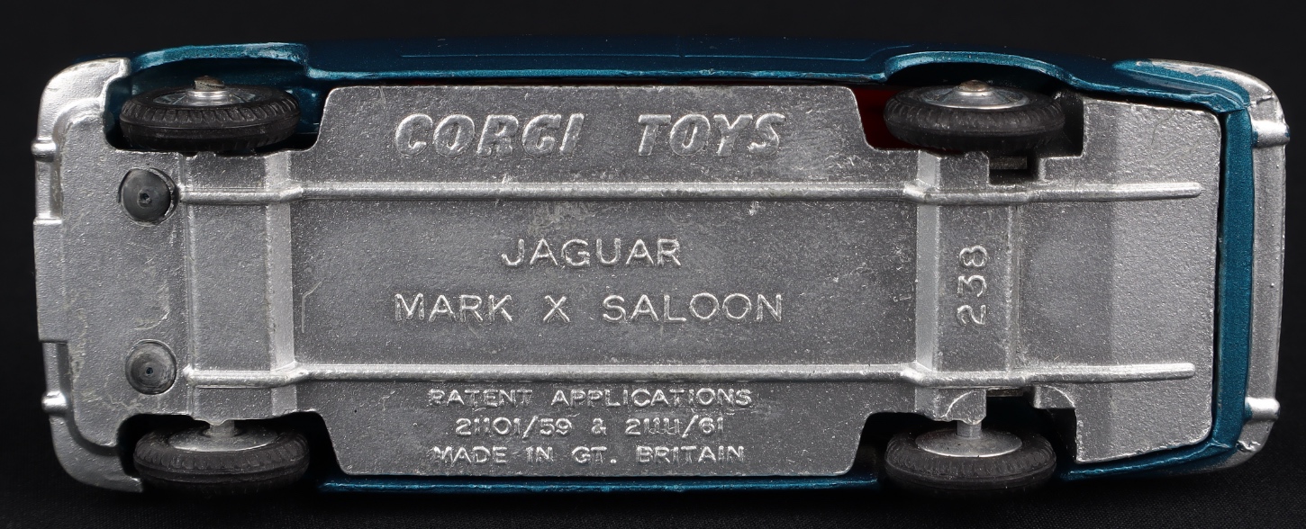 Jaguar Mark X by Corgi Toys, No. 238. Very near mint/boxed. Scarce Kingfisher Blue with RED interior. Luggage. From The Elmer Collection.