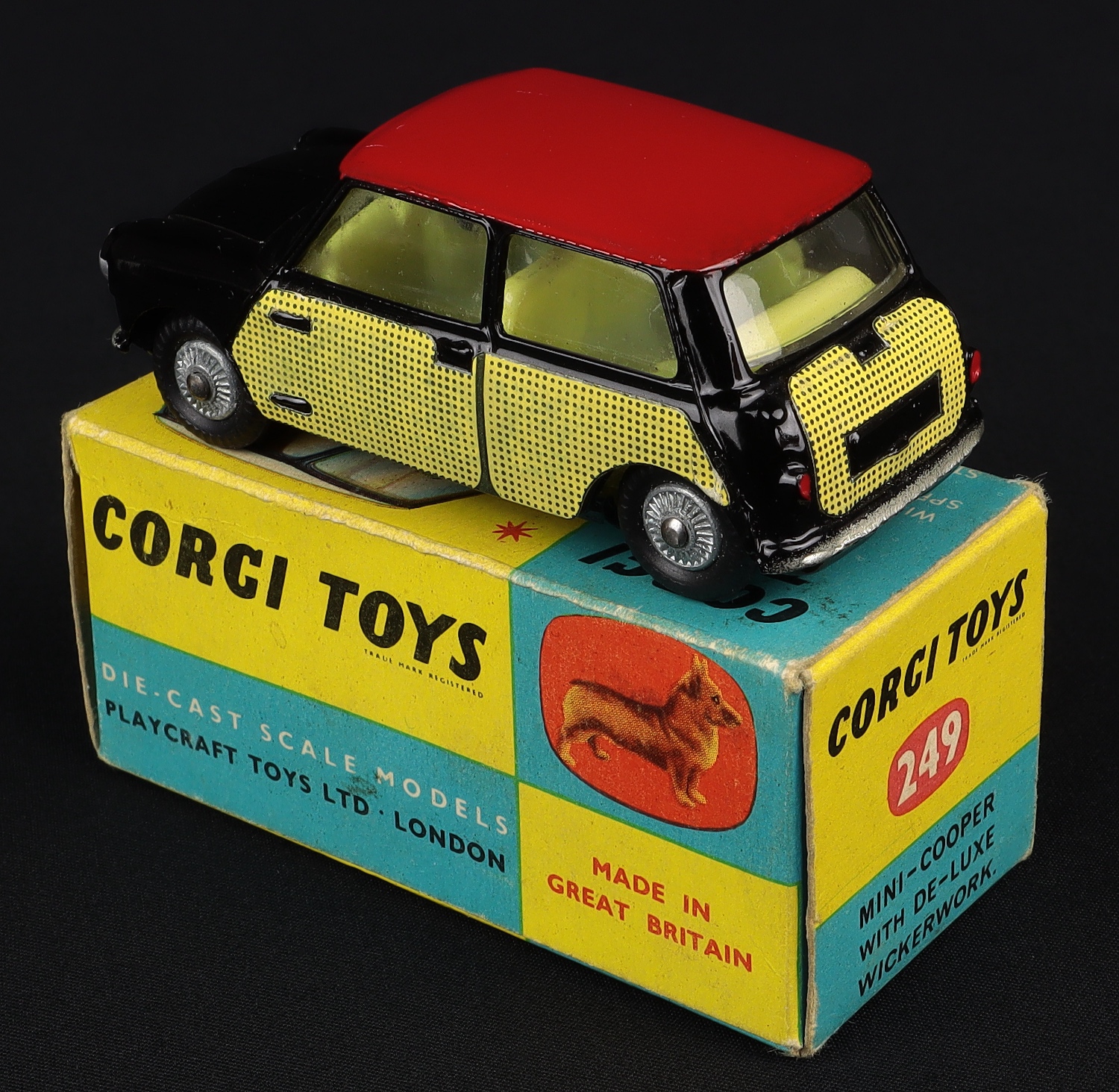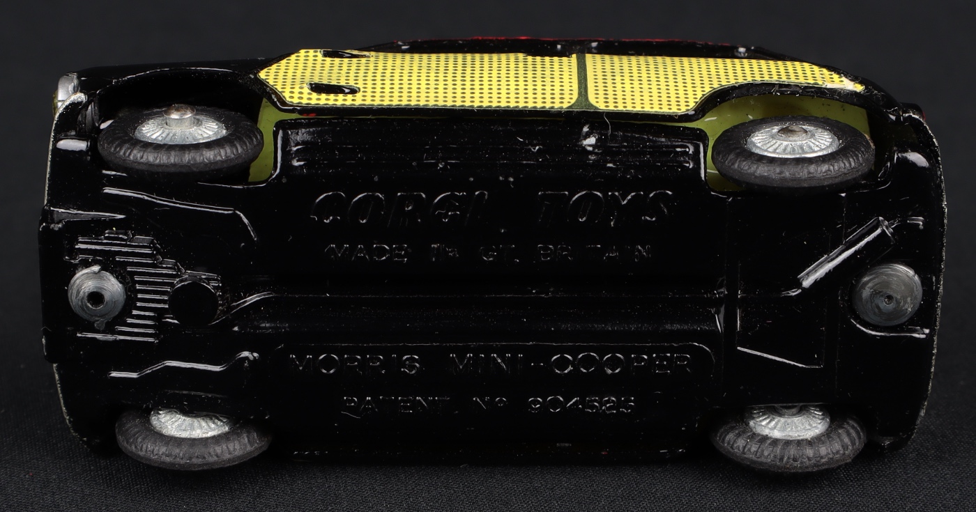Morris Mini-Cooper 'Wickerwork' by Corgi Toys, No.249. Very near mint/boxed. EARLY cast wheel issue WITHOUT horizontal front wing casting line. Scarce. From The Elmer Collection.