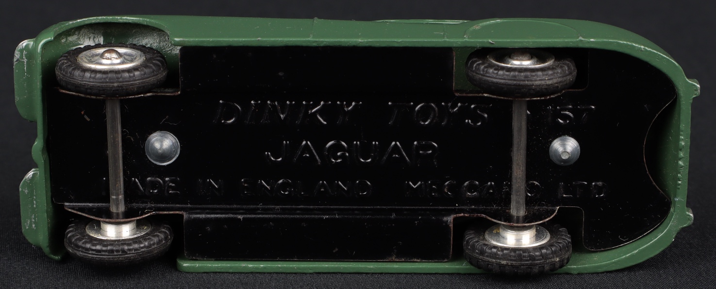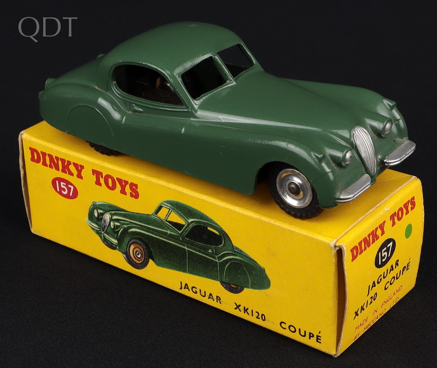 Jaguar XK120 Coupe by Dinky Toys, No. 157. Grey-green issue. Very near mint/boxed. Scarce spun wheel version with treaded tyres. From The Berlin Collection.