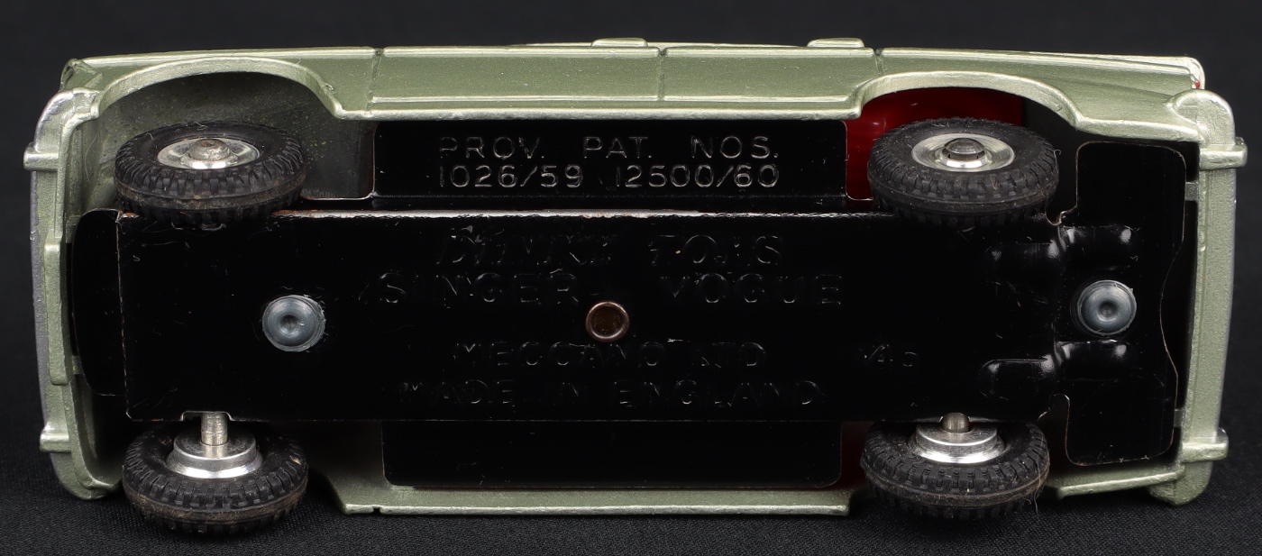 A beautiful Dinky Singer Vogue car with an almost pearlescent sheen to the delicate pale metallic green finish. Shining shaped spun hubs with suspension and a red detailed interior, ivory-coloured steering wheel. Most attractive distinctive radiator. Fine original treaded tyres.