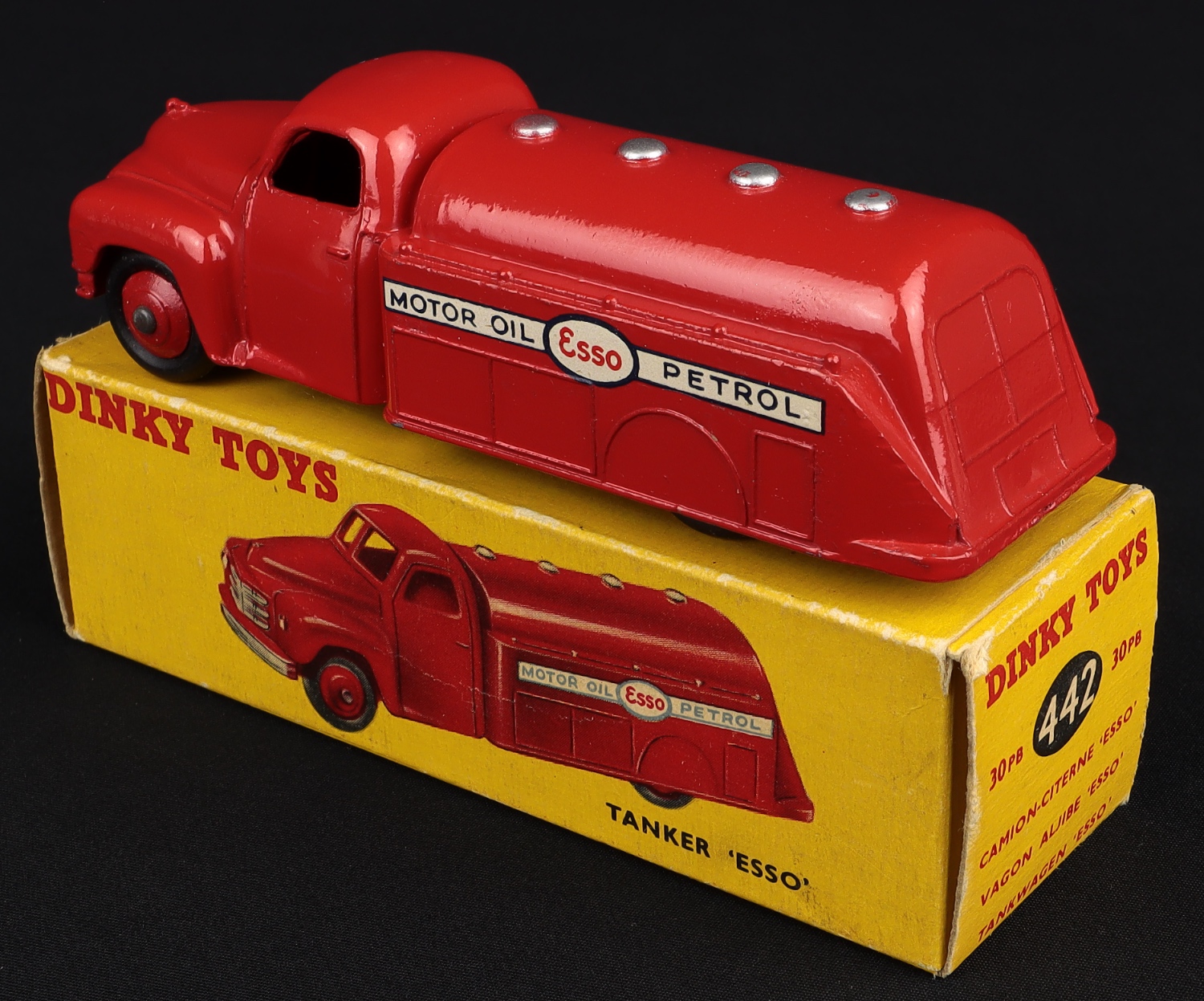 Petrol Tanker 'ESSO' by Dinky Toys, No. 30PB 442 Very near mint/boxed. Scarce version with DARK BLUE LETTERING. Scarce 1954 model from The Reference Collection.