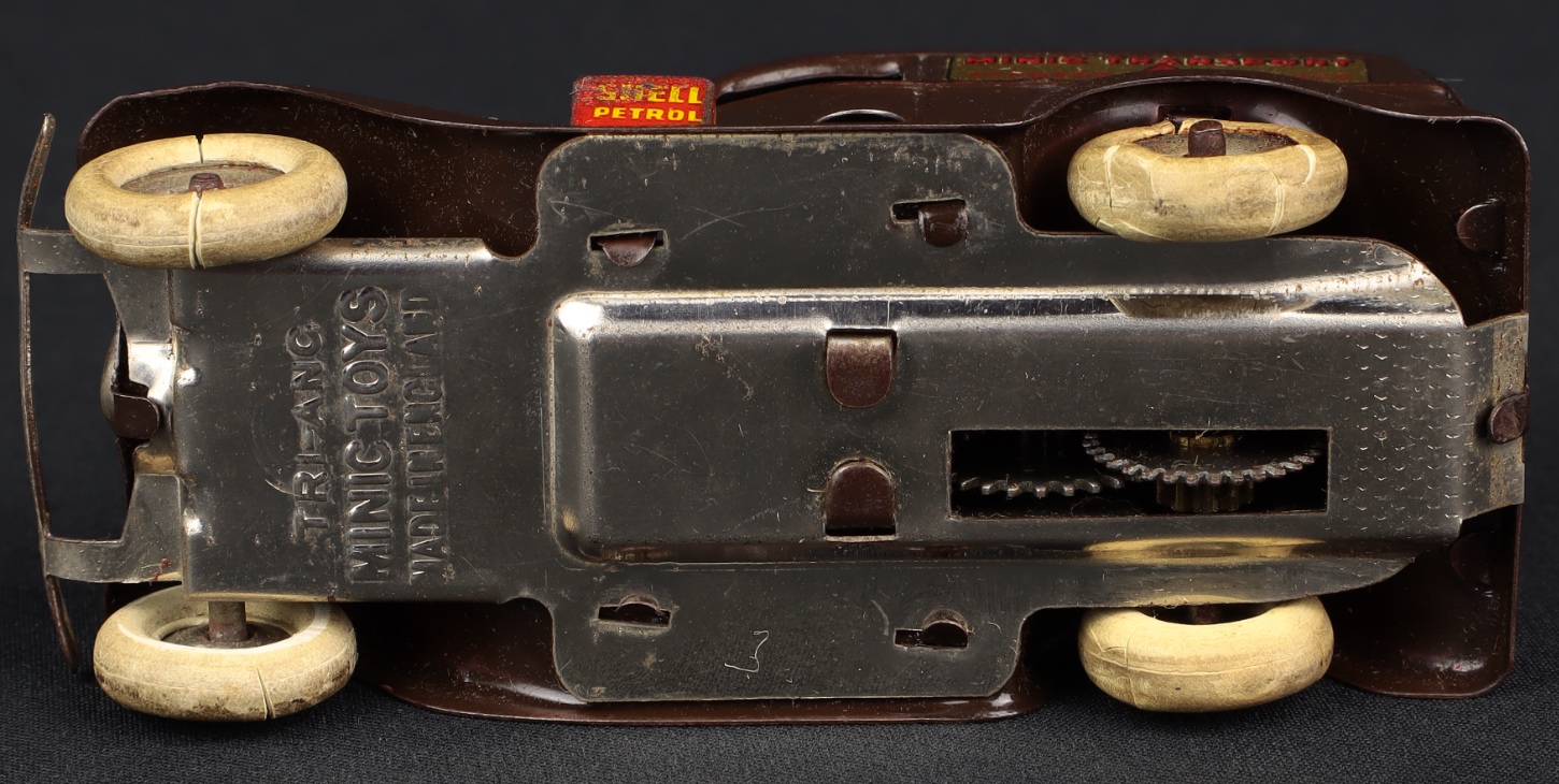 An endearing reminder of a bygone age, this Ford Light Van in this distinctive deep beige shade has virtually complete – complete attractive ‘MINIC TRANSPORT’ transfers on both sides.Nearly complete ‘TRI-ANG MINIC’ lettering at the rear. Original white tyres (some of the expected age wear now). With petrol can at the side (some tarnishing), this pre-war version measures just 8.5 cms.