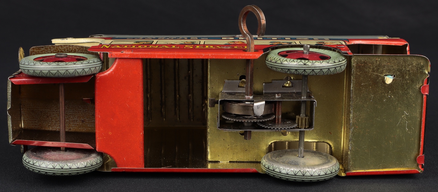 ‘NATIONAL SERVICE’ & ‘THANKS FOR BUYING BRITISH’ at the sides. One piece tinplate ‘balloon-style’ wheels are grey & maroon. "BRITISH TOYS ARE THE BEST’ at the rear.