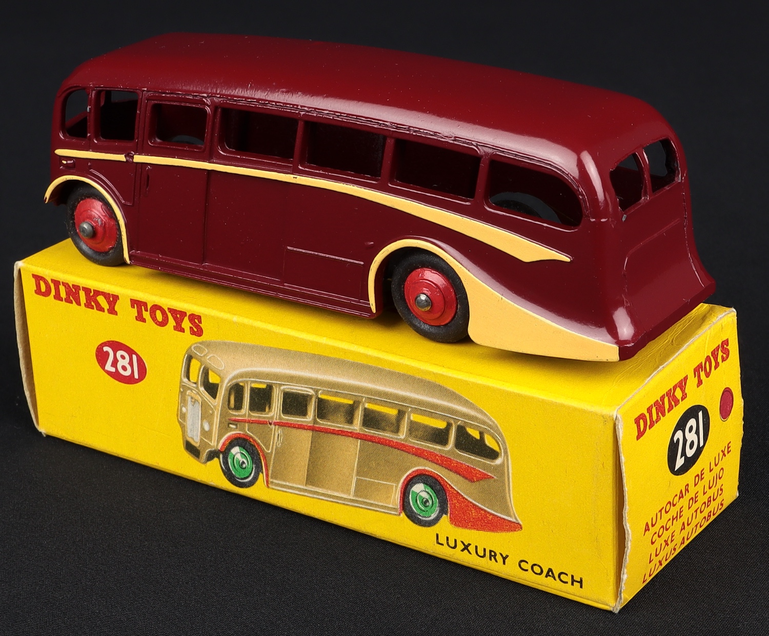 Luxury Coach by Dinky Toys, No. 281. Very near mint/boxed. Maroon with cream flashes. From The Reference Collection of fine Dinky.