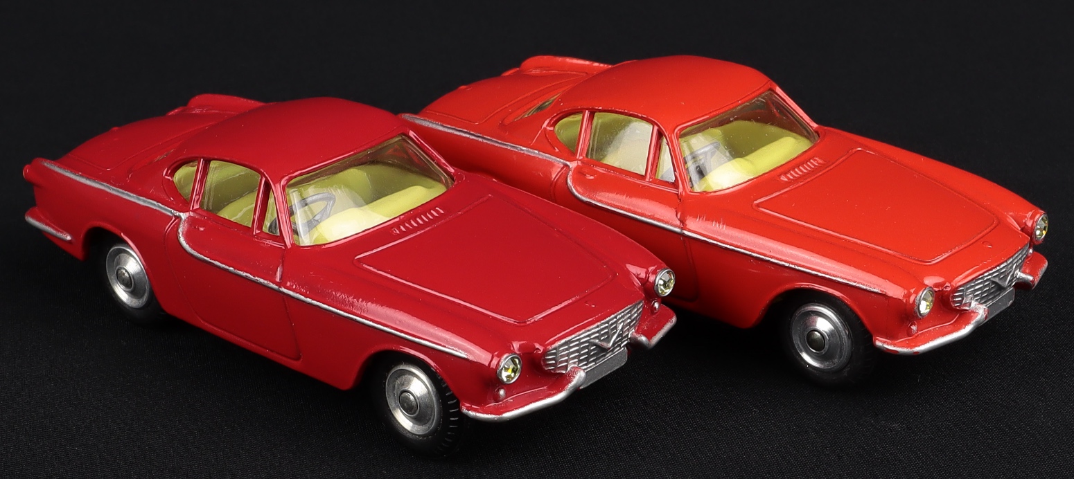 This Volvo model has a wonderfully lustrous bright orange-red or scarlet paint finish with a lemon interior and silver detailing at the raised body lines and bumpers (all original). Suspension on shiny shaped spun hubs. A more difficult find (more usually found in a deeper red).