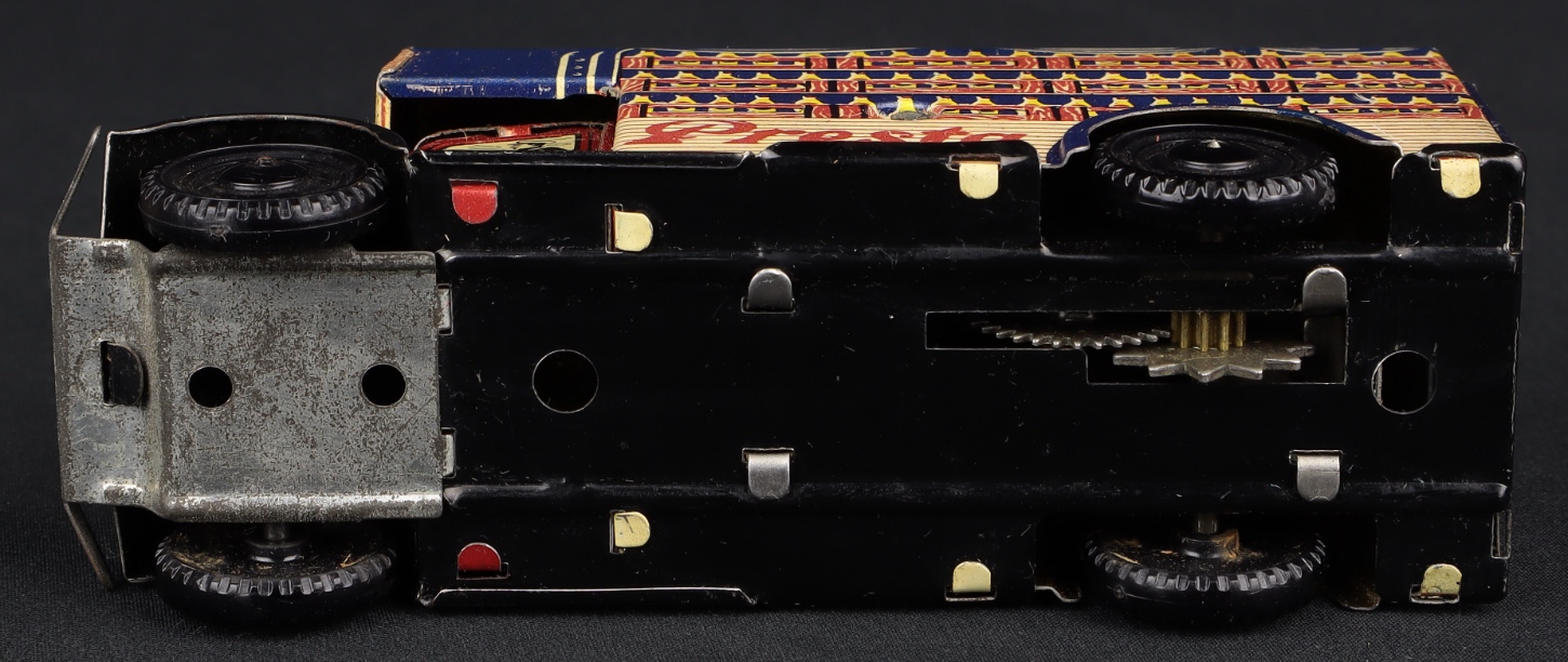 This eye-catching Removal Van ‘PRESTA’ has charming lithography and a working clockwork motor. One-piece black plastic wheels with tyre detail. Bright and complete ‘PRESTA’ advertisement on the roof and detailed lithography at the sides with PRESTA logo. Scarce with brown cab. Measures approx 11cms.