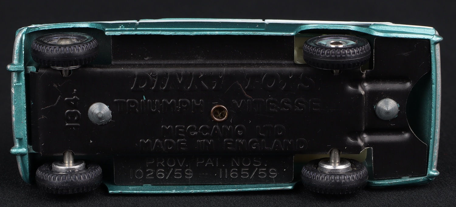 This Triumph Vitesse has an original metallic green-blue paint finish with a white side stripe, pale fawn interior, spun wheels with suspension. Matte baseplate. Original, well-shaped fine tread tyres.