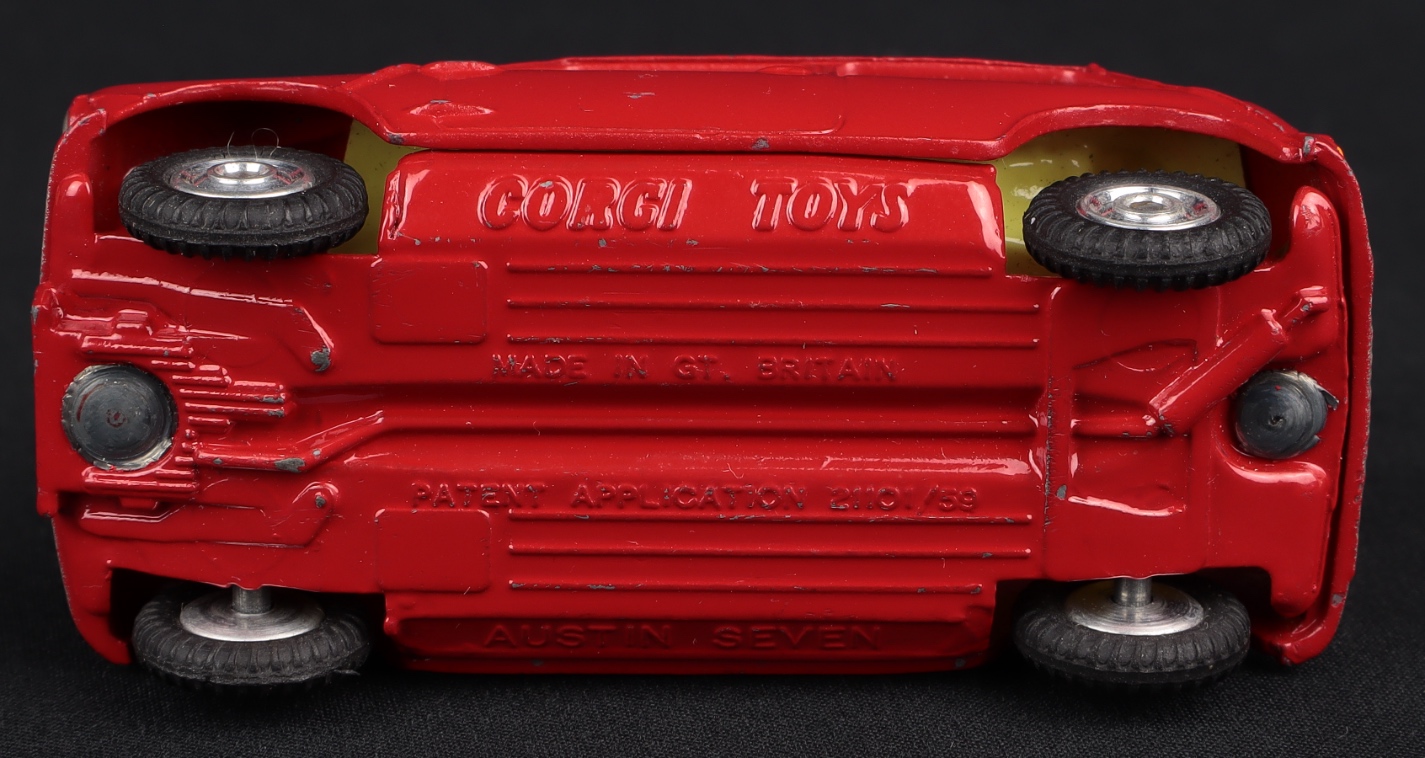 Austin Seven Saloon by Corgi Toys, No. 225. Vivid red issue. SHAPED SPUN WHEEL issue & early base with Patent Application. Near mint plus/boxed. From The Rickman Collection.