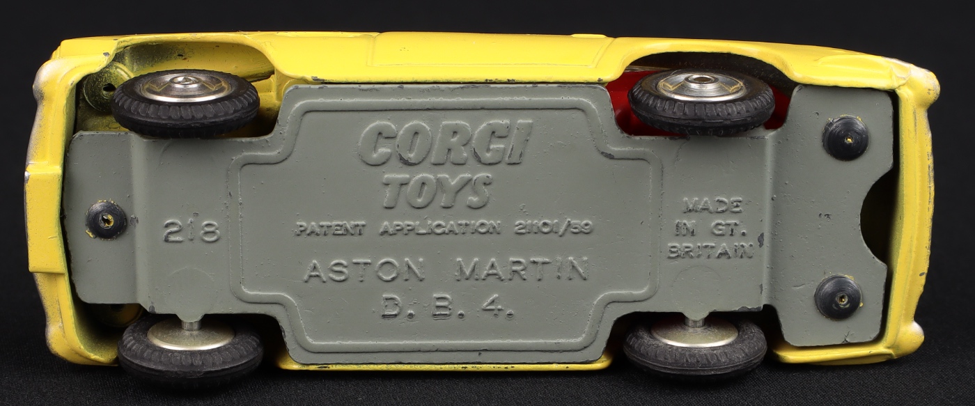 Aston Martin D.B.4 by Corgi Toys, No. 218. Very near mint/boxed. Yellow version with SHAPED spun wheels & OPEN bonnet vent. Such a rare find! From The Berlin Collection.