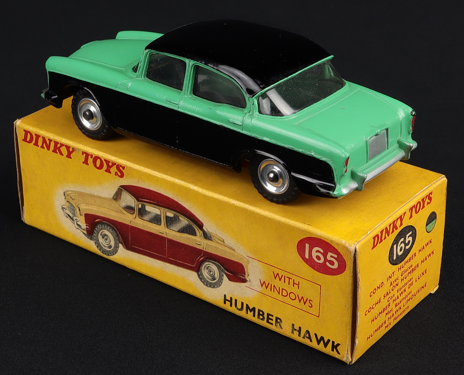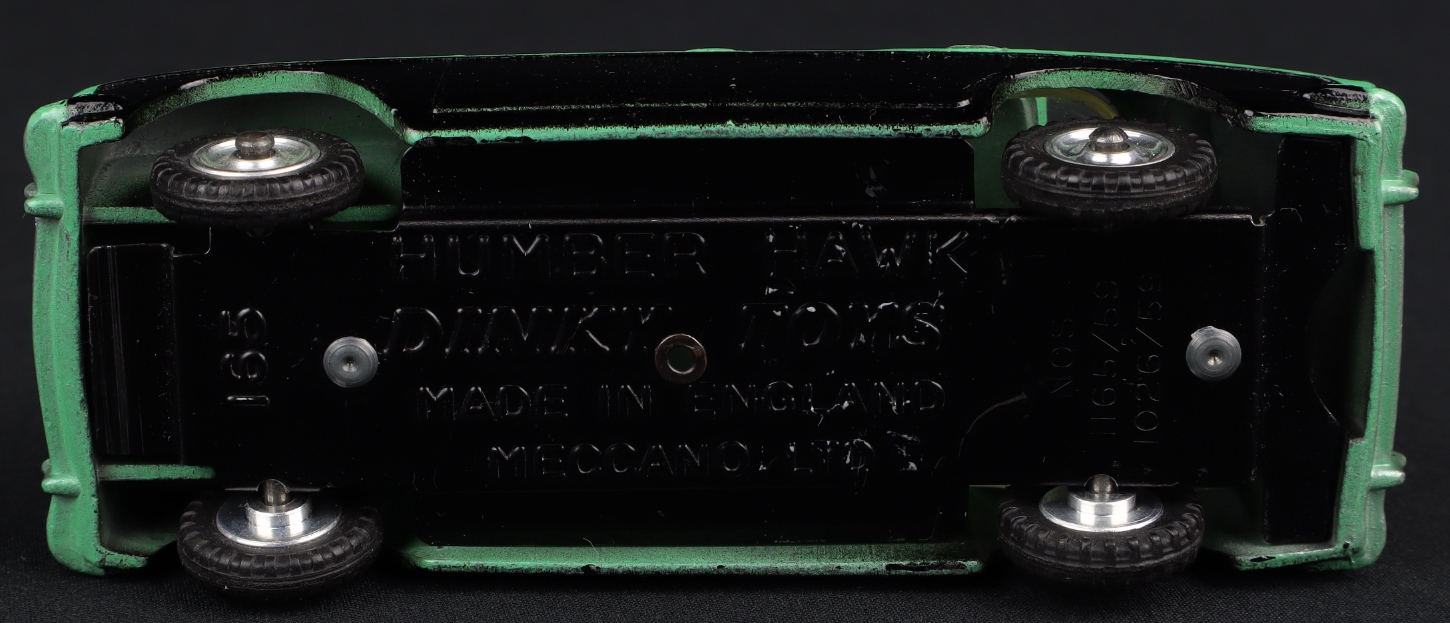 Humber Hawk (with windows) by Dinky Toys, No. 165. Very near mint/boxed. Green & black version with spun wheels. From The Berlin Collection.