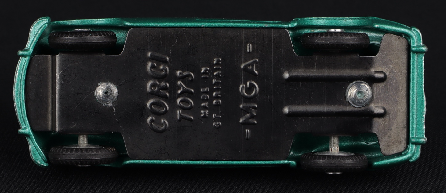 M.G.A. Sports Car by Corgi Toys, No. 302. Very near mint/boxed. Metallic green version, FLAT SPUN wheels. From The Berlin Collection.