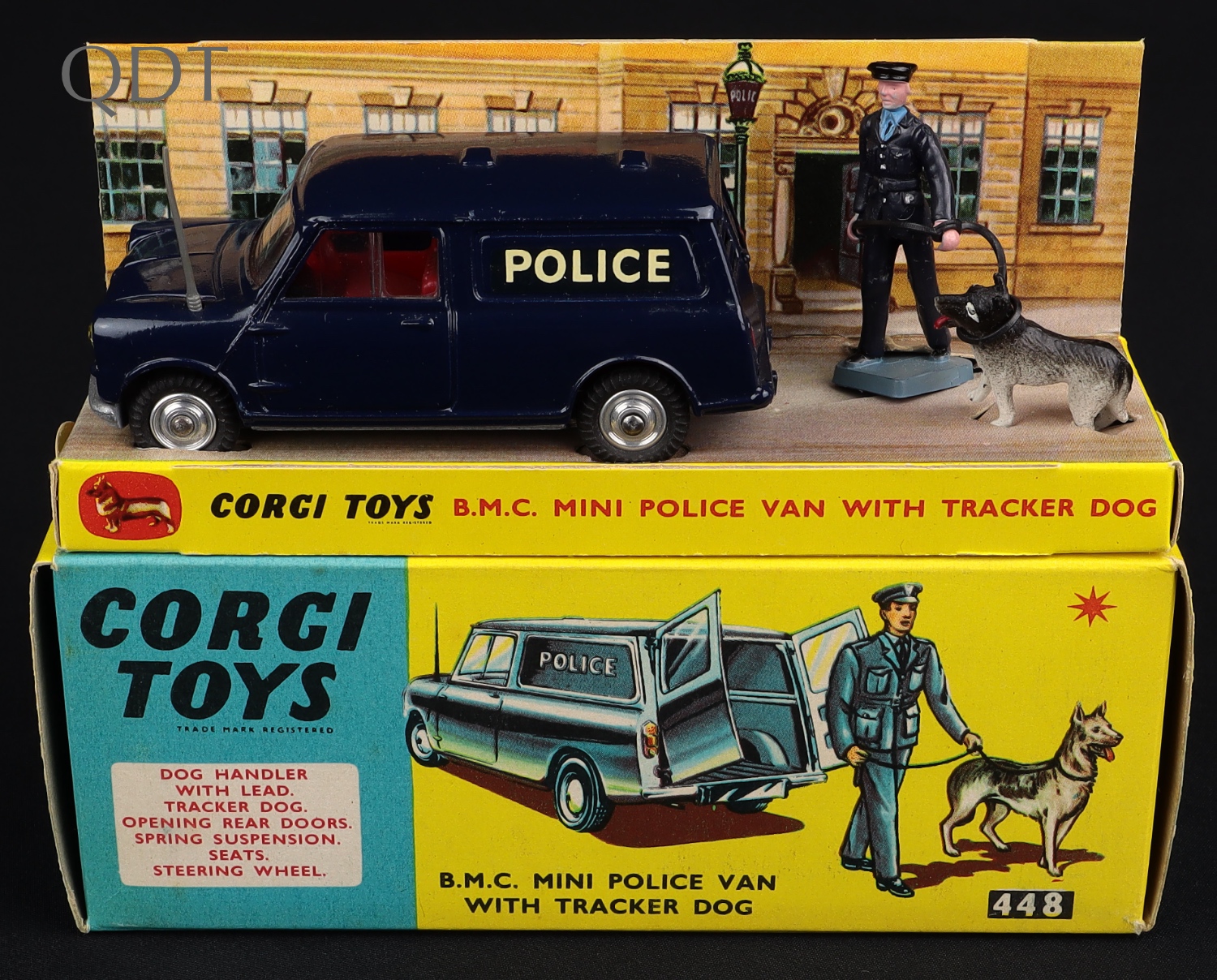 B.M.C. Mini Police Van With Tracker Dog by Corgi Toys, No. 448. Spun wheels & COUNTRYMAN BASE. Rare - and a First for QDT! Very near mint/boxed. From The Rickman Collection. QDT starting bid £175. Please note that QDT apply 12.5% buyer's commission.
