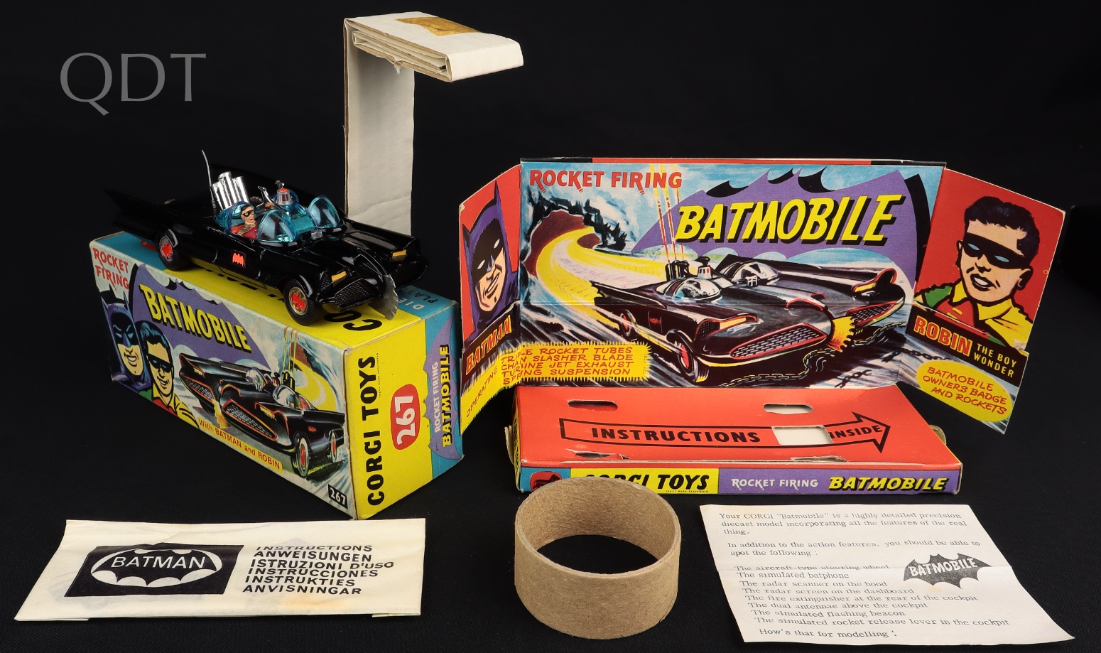 Batman's Batmobile by Corgi Toys, No. 267. Near mint/boxed. Most sought-after 1st issue, correct without tow hook. With all accessories & all packing. From The Elmer Collection. Starting bid £200. Please note that QDT apply 12.5% buyer's commission.