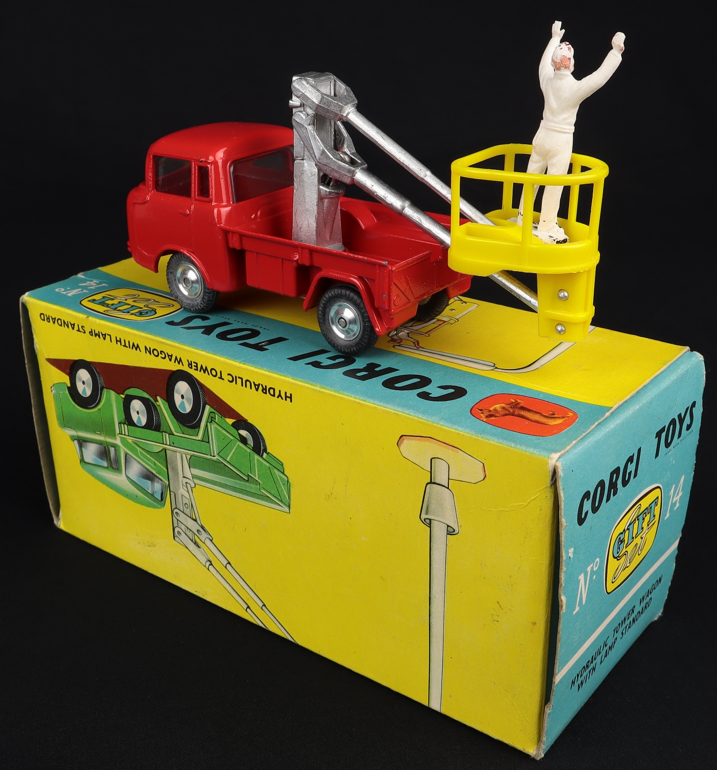 Hydraulic Tower Wagon with Lamp Standard by Corgi Toys, Gift Set 14. Red issue with SHAPED SPUN WHEELS. Near mint plus/boxed. Scarce. From a small private collection in Germany. QDT starting bid £125. Please note that QDT apply 12.5% buyer's commission.