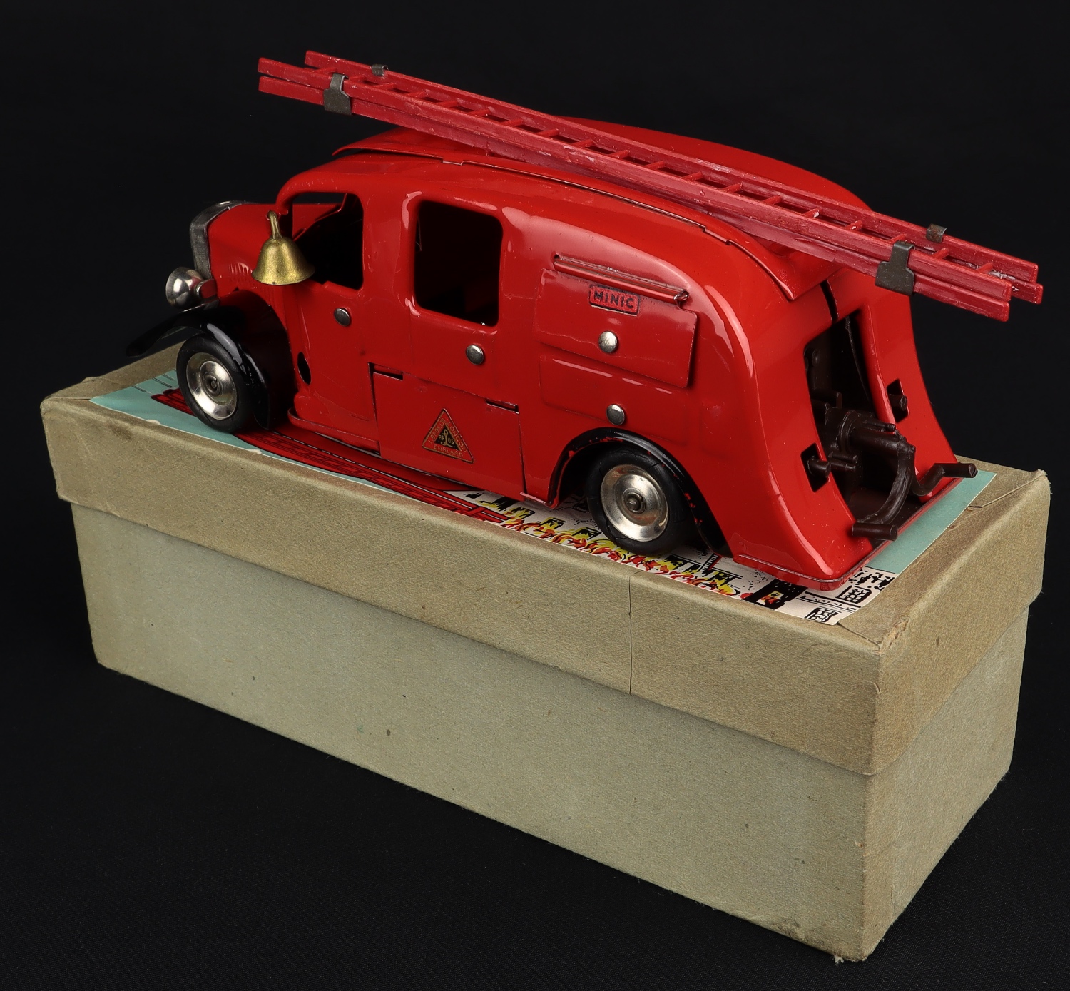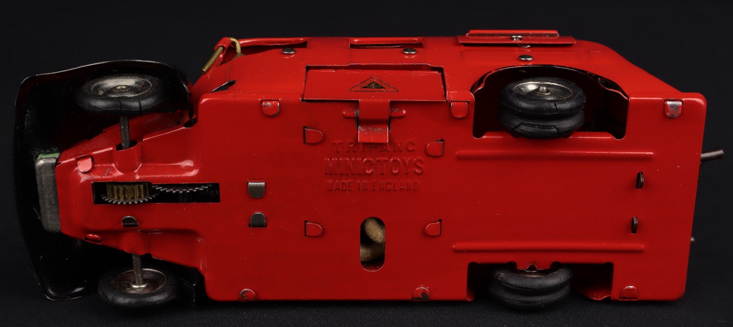 Fire Engine by Triang Minic, No. 62M. Red and black, with tin wheels. Post-war issue Very near mint/boxed, with MINIC KEY. From The Denis Tyler Collection. Starting bid £100. Please note that QDT apply 12.5% buyer's commission.