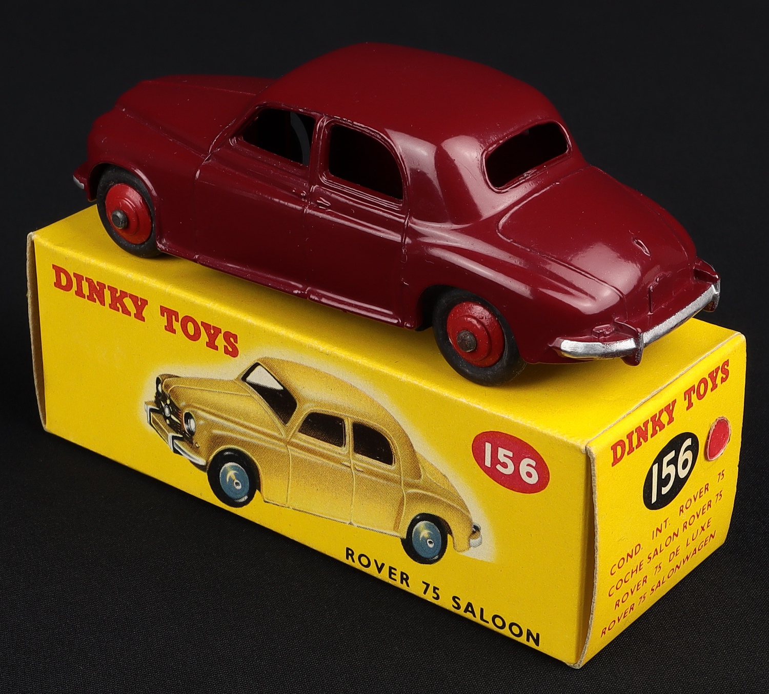 Rover 75 Saloon by Dinky Toys, No. 156. Maroon with red wheels version. Large print baseplate. 'ROVER' cast onto roof underside. Very near mint/boxed. Scarce. Fresh box! From The Reference Collection. QDT starting bid £250. Please note that QDT apply 12.5% buyer's commission.