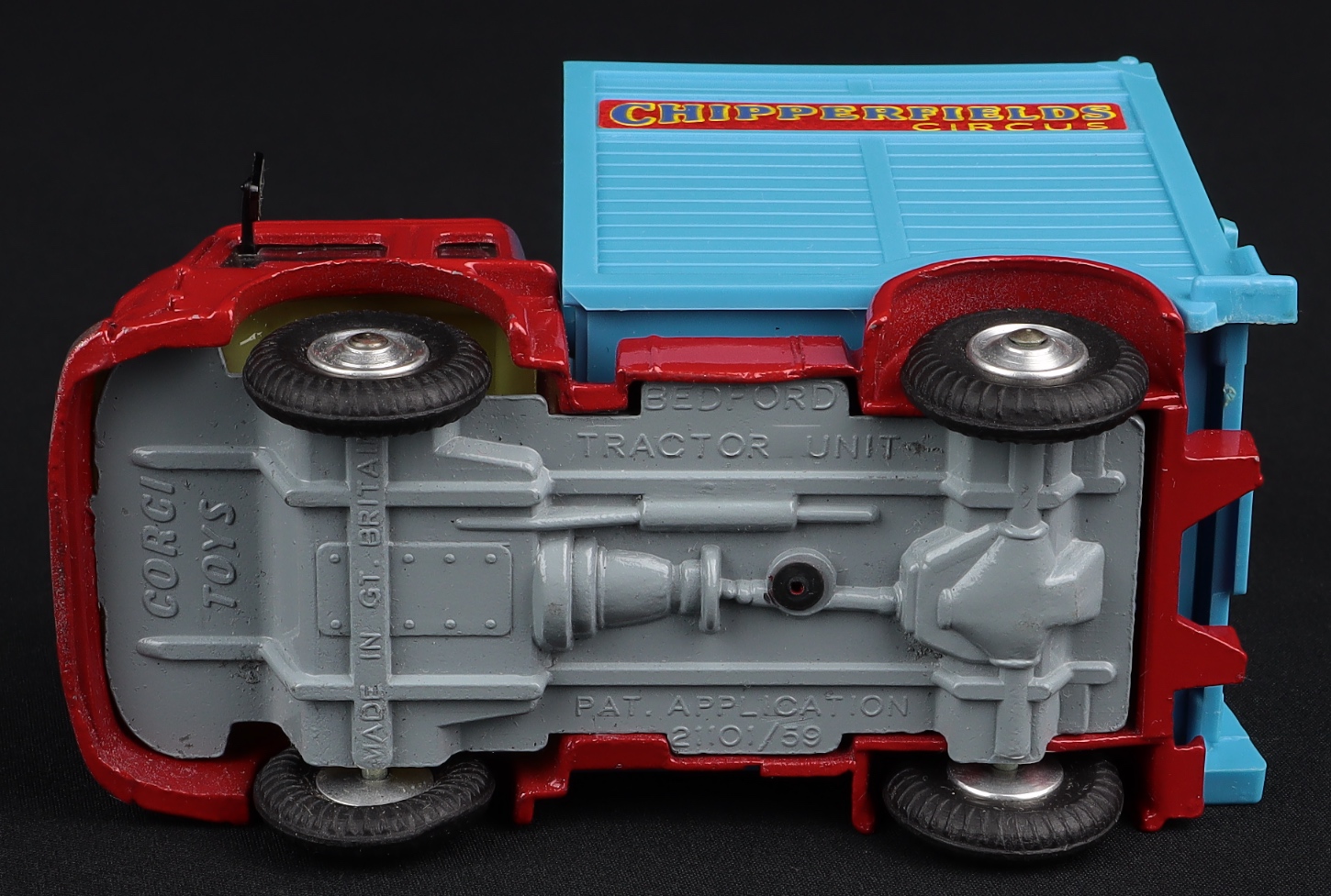 A lovely example from this popular range of circus models issued between 1964-70. Really close to mint Bedford TK Truck with spun wheels. Complete and bright “CHIPPERFIELDS CIRCUS” labels on both sides and, of course – *two original giraffes (one mother and baby).