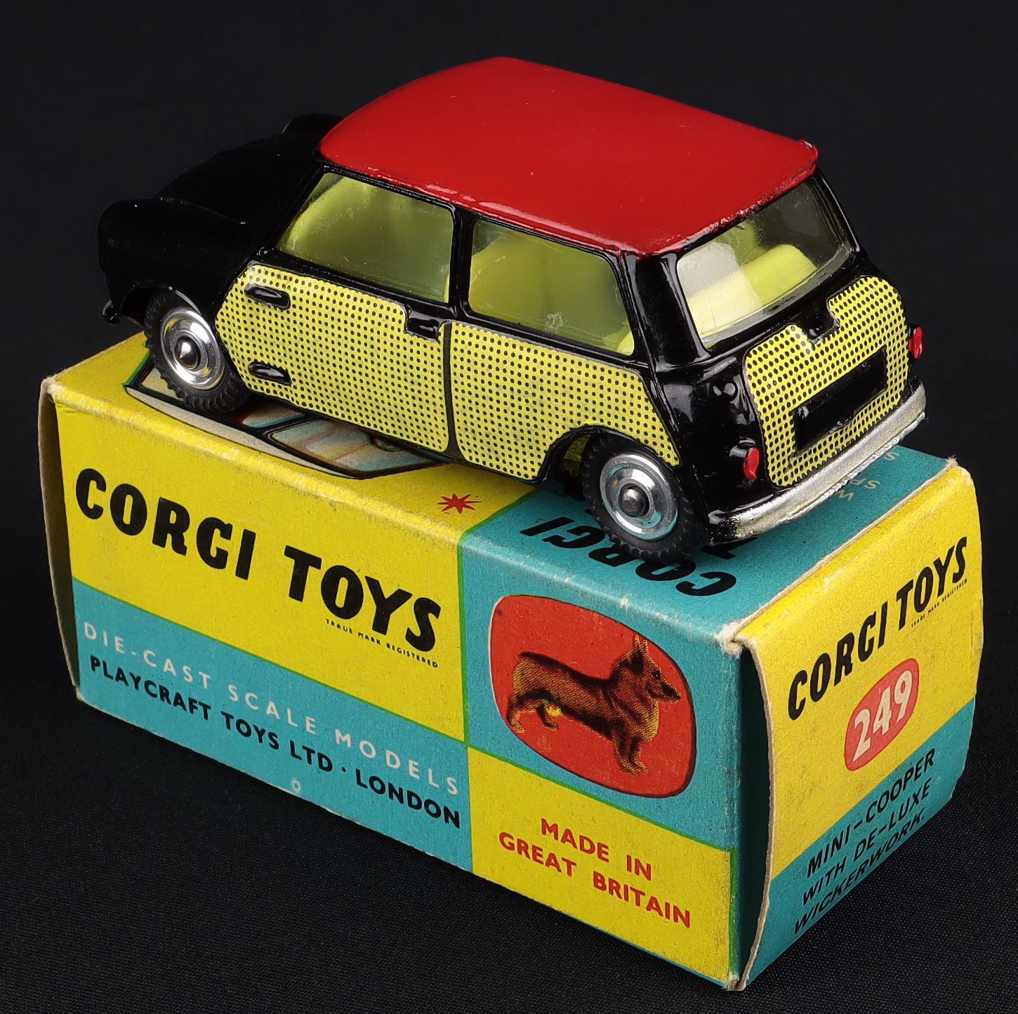 Morris Mini-Cooper 'Wickerwork' by Corgi Toys, No. 249. Spun wheels. Early casting without horizontal front wing casting line. Very near mint/boxed. From The Rickman Collection.