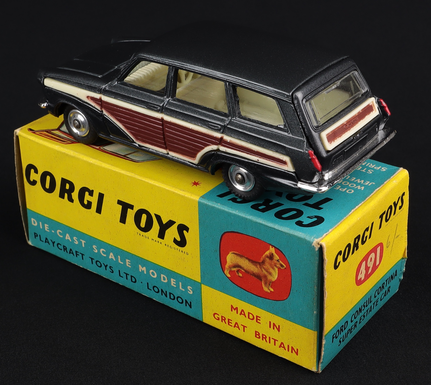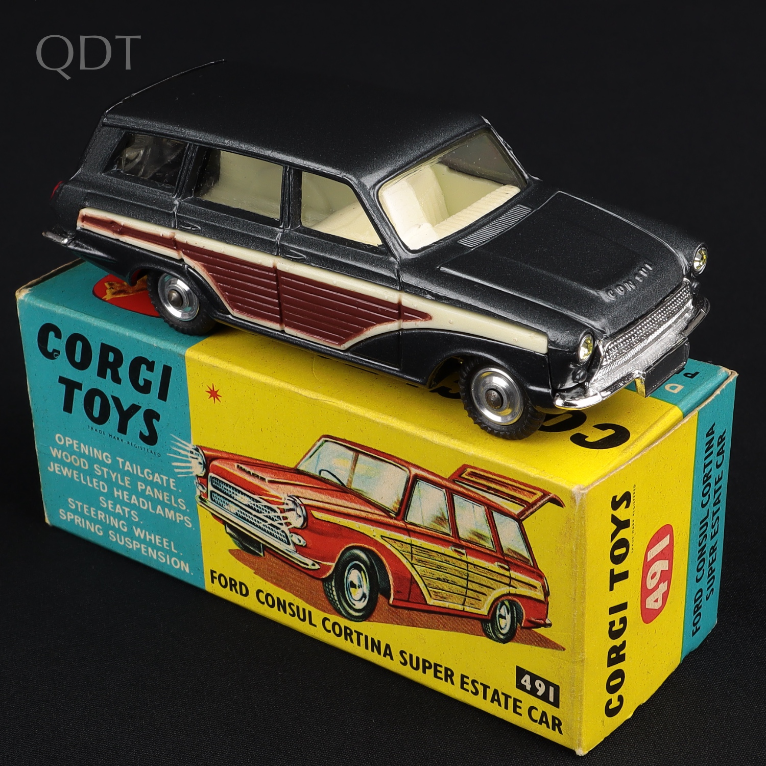 Ford Consul Cortina Super Estate Car by Corgi Toys, No. 491. Very, very near mint/boxed. Graphite grey issue. From The Rickman Collection.