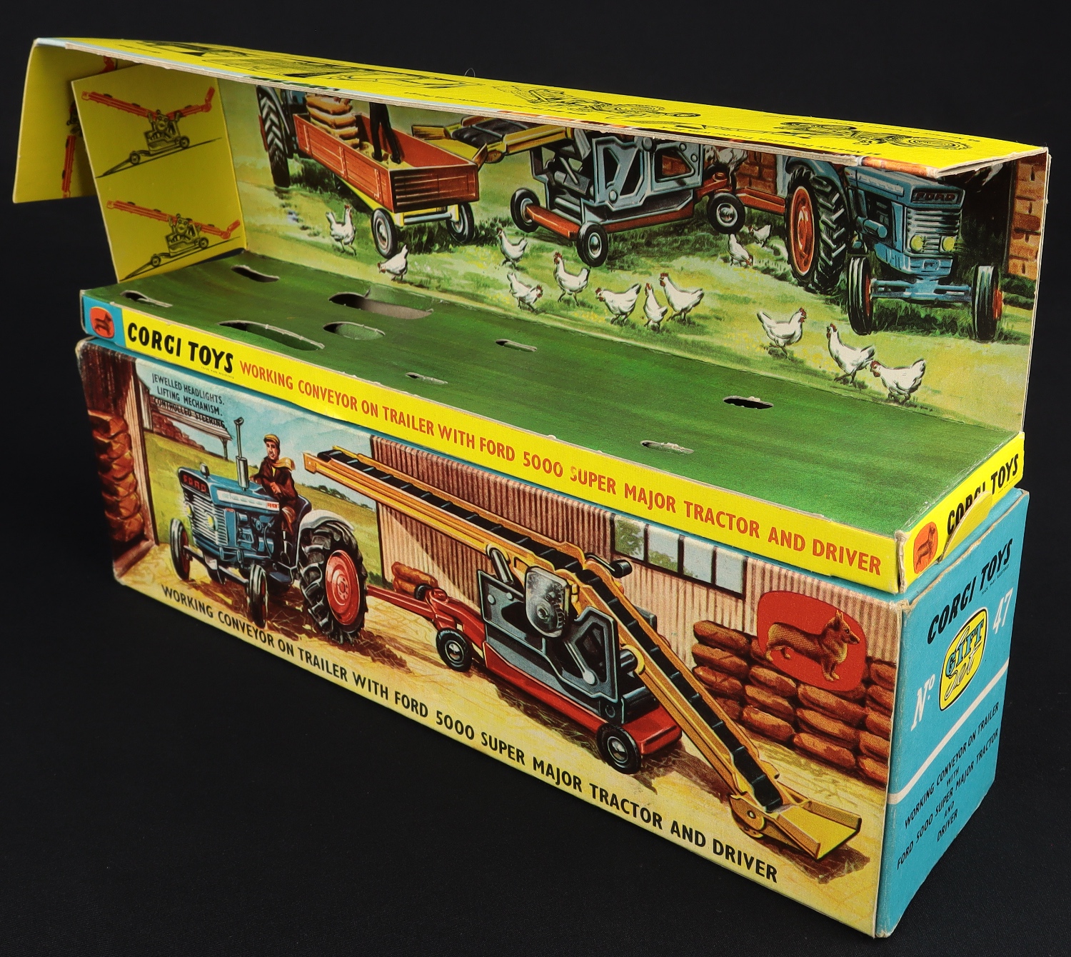 Working Conveyor on Trailer with Ford 5000 Super Major Tractor & Driver by Corgi Toys, Gift Set No. 47. Version with CHROMED Chimney Stack. Near mint plus/boxed. With 4 original Bags. From The Elmer Collection.