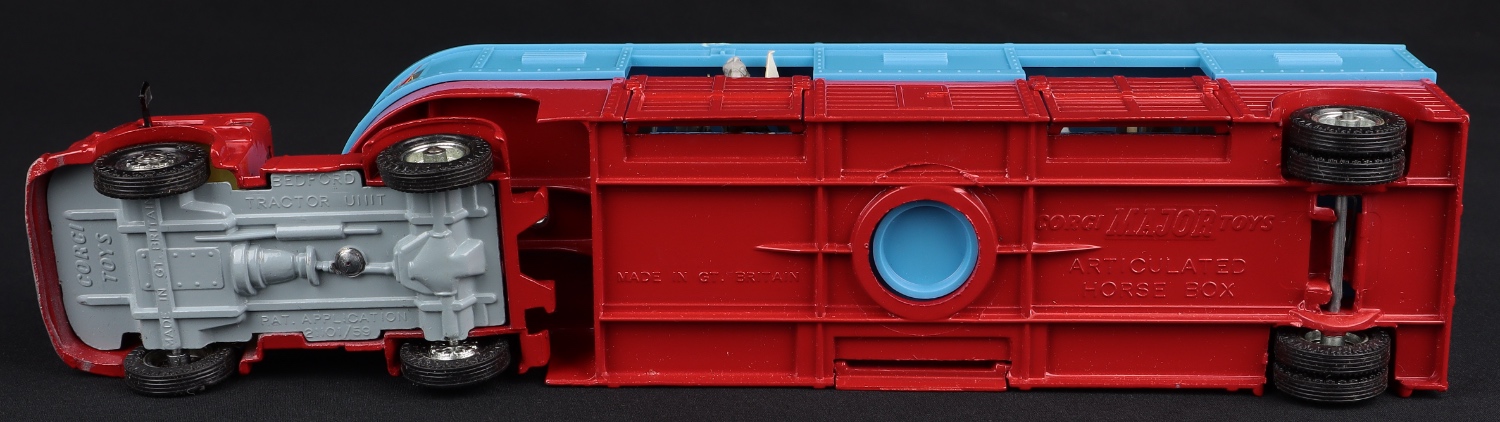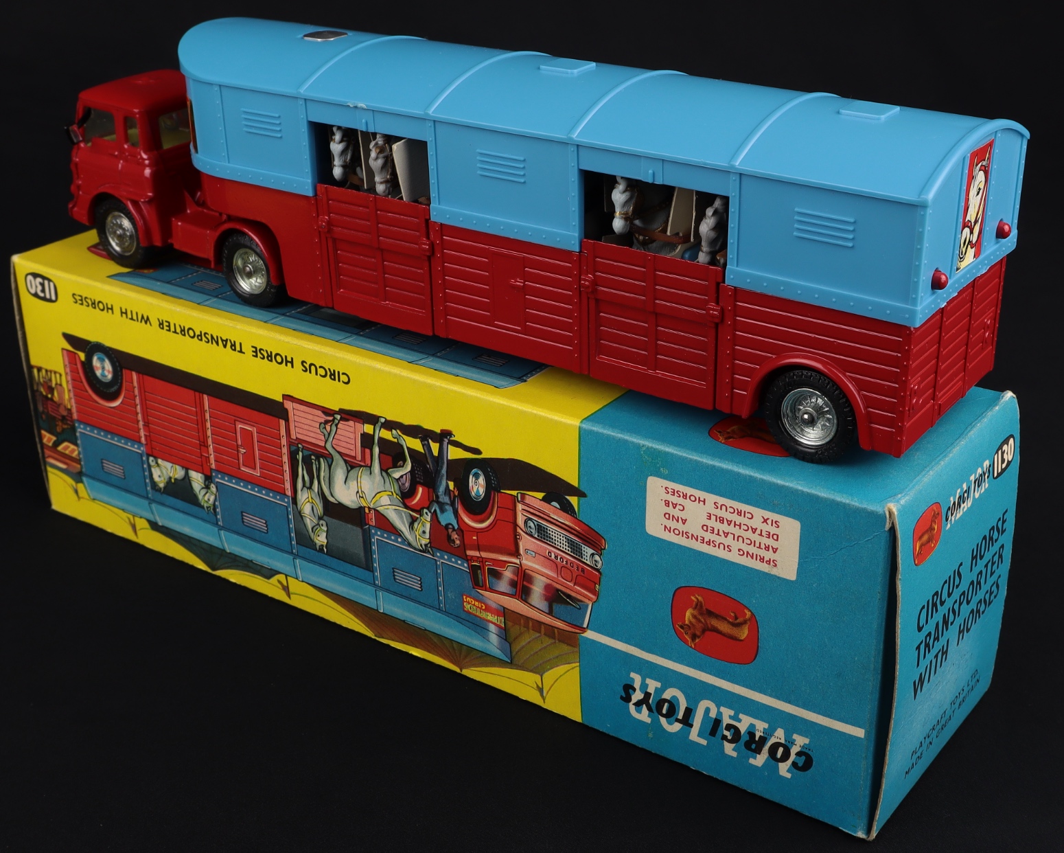 Circus Horse Transporter with Horses by Corgi Toys, No. 1130. Very, very near mint/boxed. Scarce with cast wheels! With six grey horses & individual wrap-around card packing. Card packing piece sleeve. Starting bid £250. Please note that QDT apply 12.5% buyer's commission.