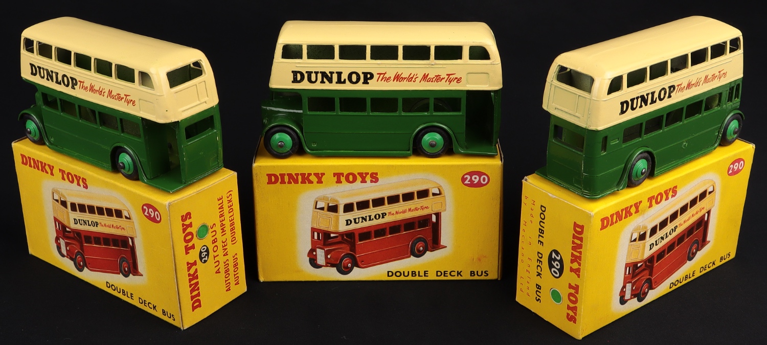 3 x Double Deck Bus 'DUNLOP' by Dinky Toys, No. 29C 290 . Very near mint - very, very near mint/boxed. Scarce find in the DUAL-NUMBERED box. Starting bid £250. Please note that QDT apply 12.5% buyer's commission.