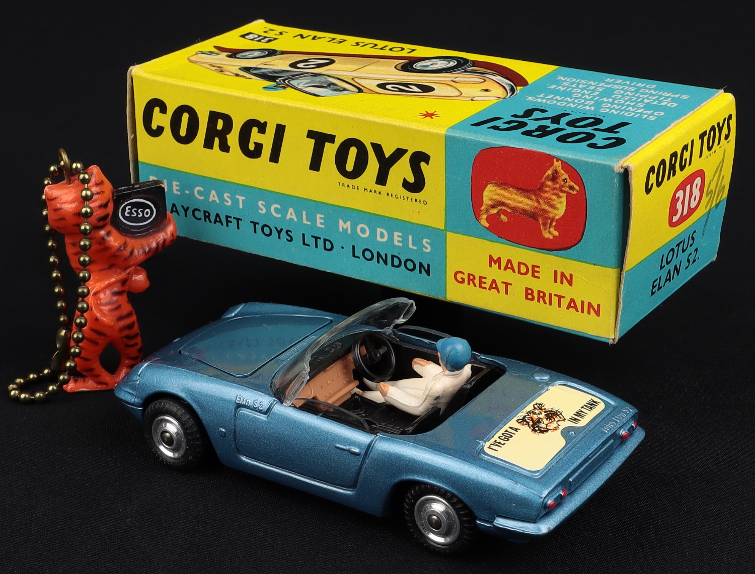 Lotus Elan S2 by Corgi Toys, No. 318. Very, very near mint/boxed. With associative period Tiger in my Tank Keyring. From The Eccles Collection..