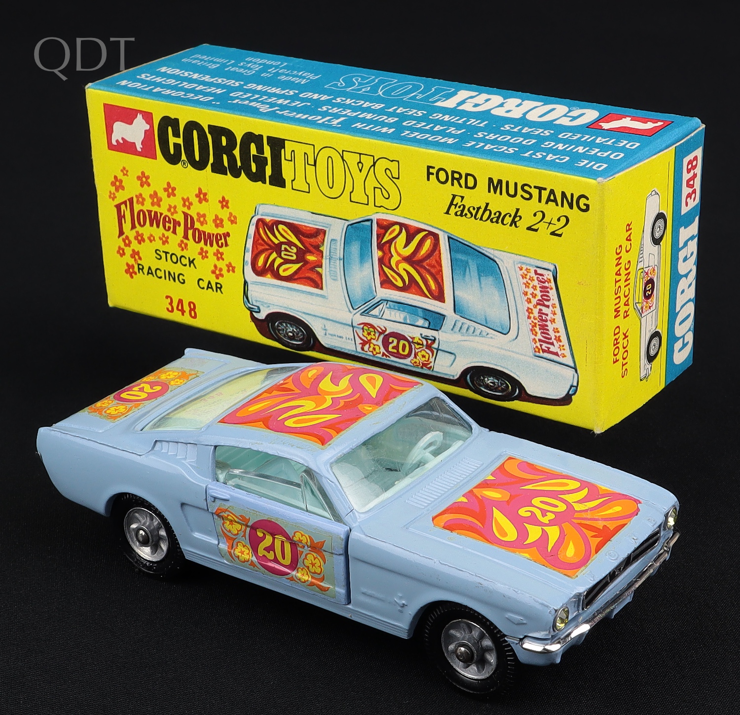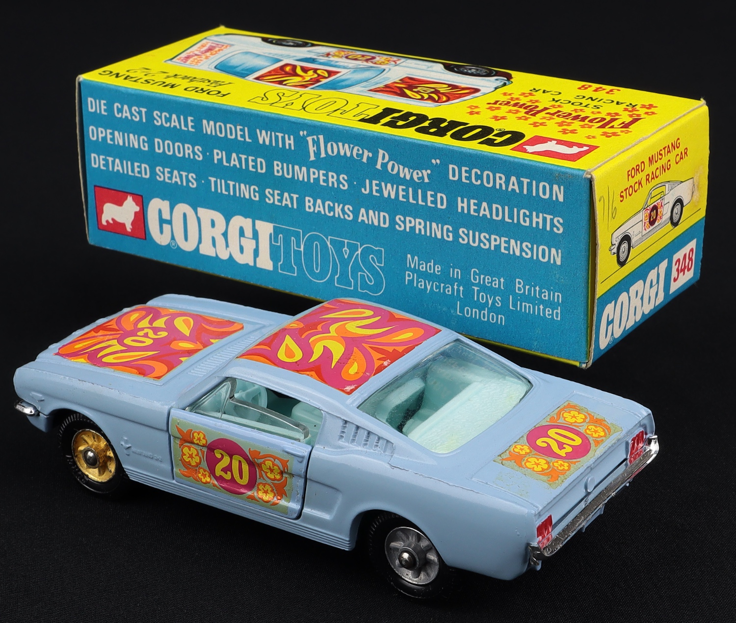 Ford Mustang Stock Racing Car 'Flower Power' by Corgi Toys, No. 348. Very, very near mint/boxed. Scarce LATE issue with CORGI EMBOSSED NYLON TYRES. Super-fresh box! From The Elmer Collection.