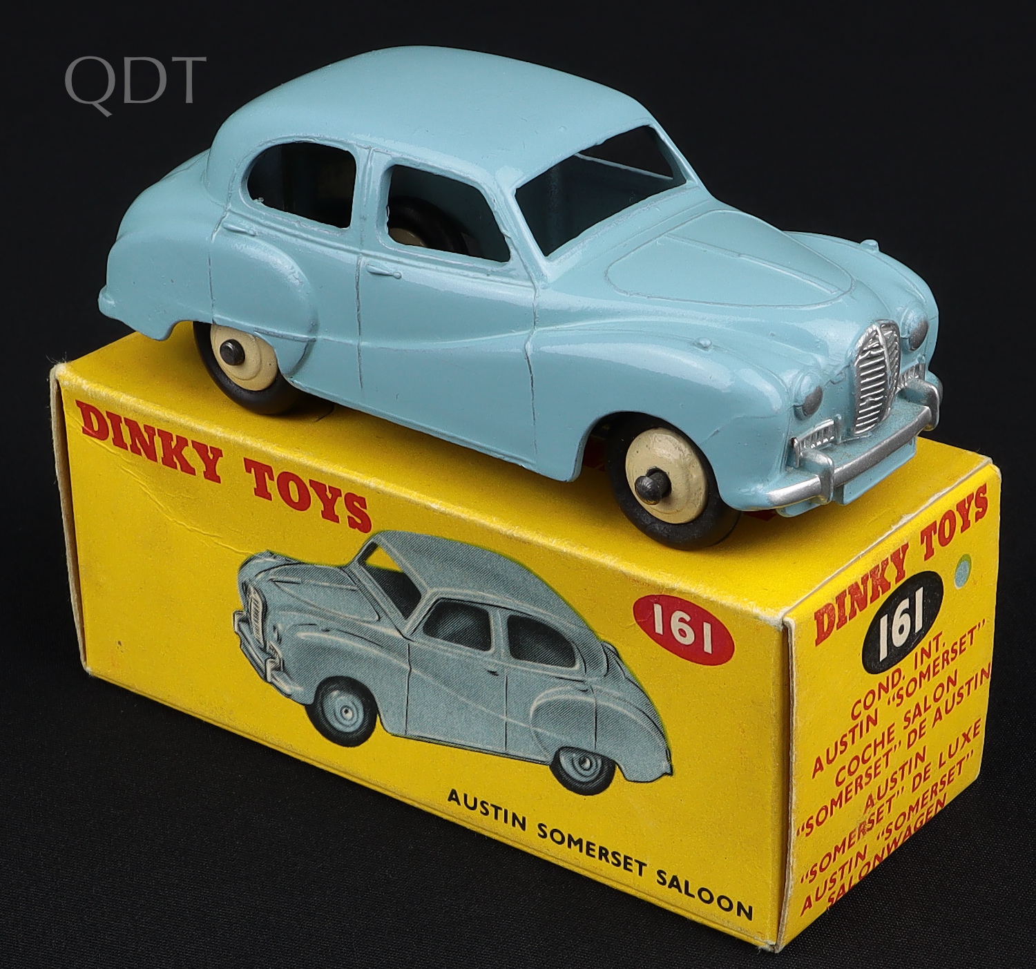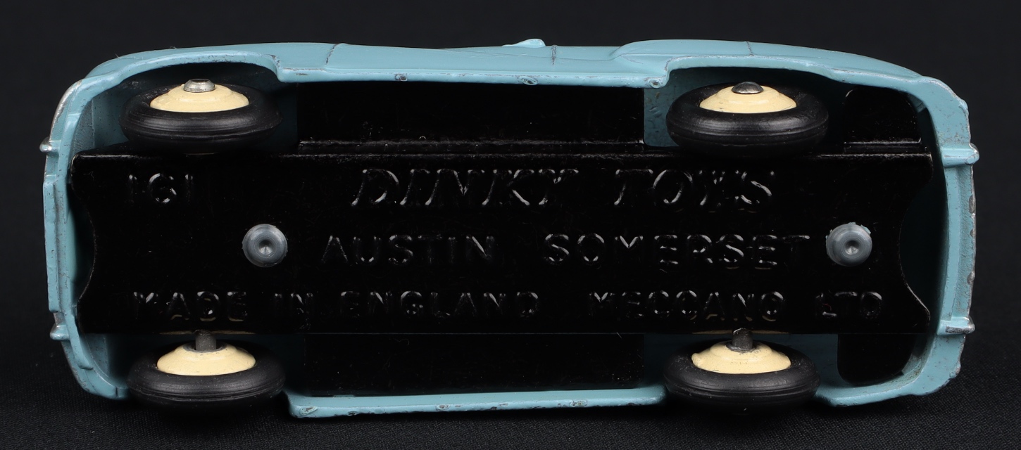 Austin Somerset Saloon by Dinky Toys, No. 161. Light blue issue with CREAM wheels. Very near mint/boxed. QDT starting bid £350. Please note that QDT apply 12.5% buyer's commission.