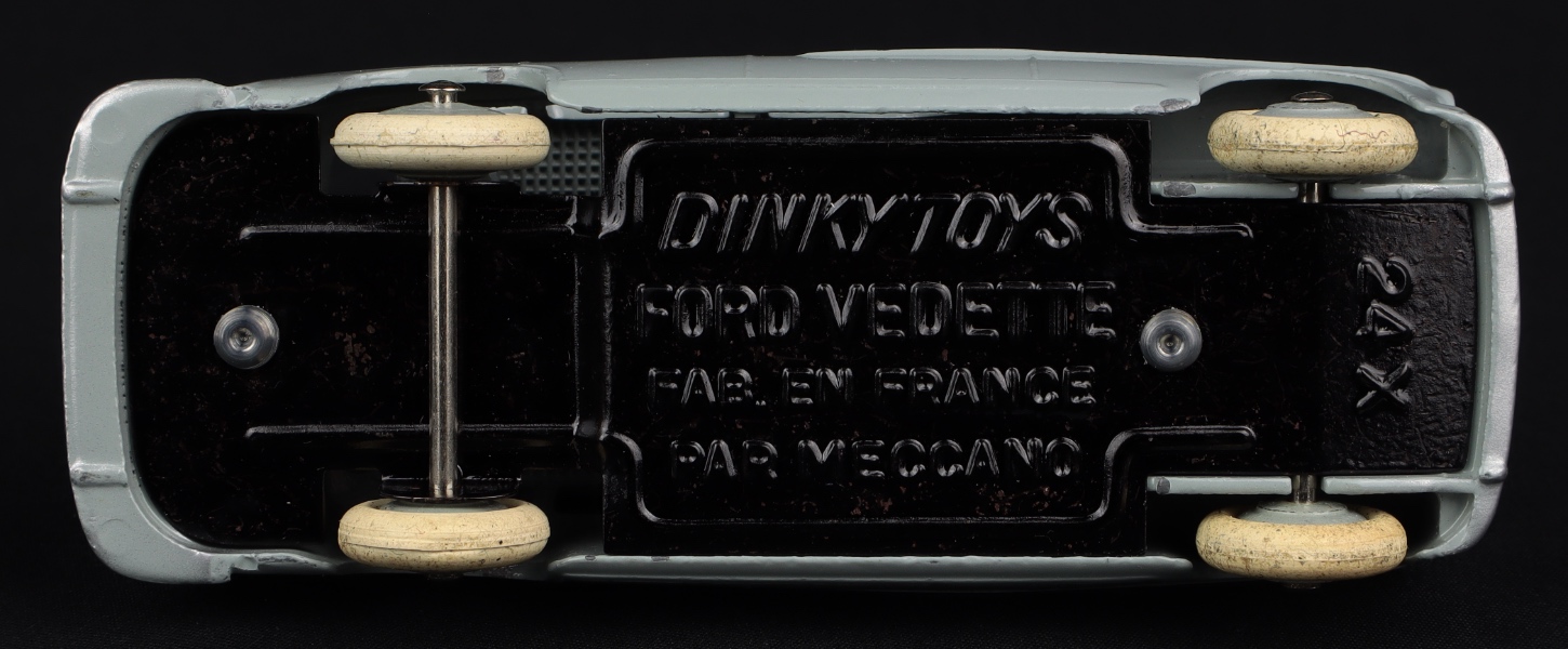 Issued between 1954-56. Very pleasing, lustrous grey finish on this Ford Vedette car with a silver trim, grey wheels, and well-shaped white tyres. Shiny baseplate has 24X stamped.
