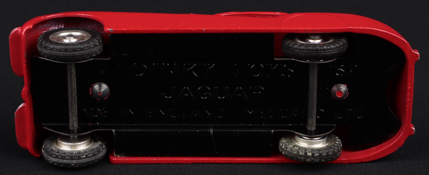 A desirable Dinky Jaguar XK120 car, especially sought-after in this colour finish and a rare find with spun wheels. In all original, lustrous vivid red finish with a nice sheen to the bright paint finish without sunfading. A gleaming bright jewel of a car.