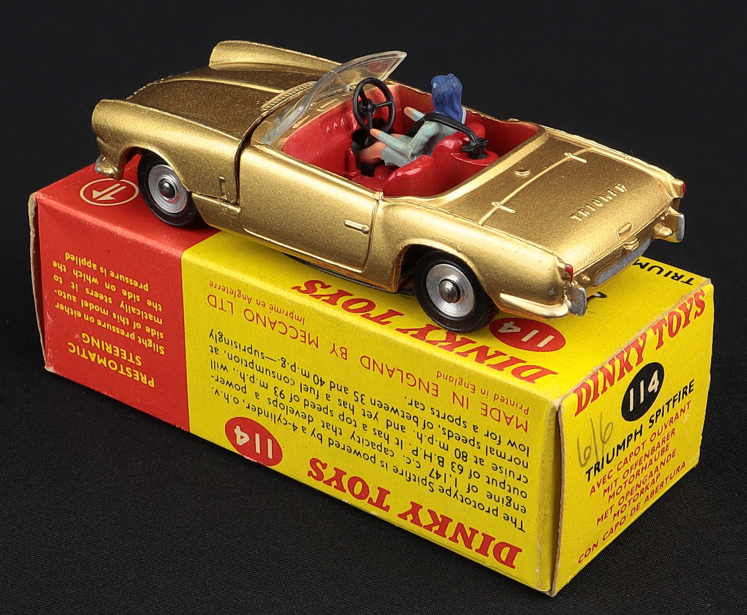 Triumph Spitfire by Dinky Toys, No. 114. Gold version. Very near mint/boxed, with card packing ring. More unusual version without boot lid logo & FULL Dashboard. From The Reference Collection.