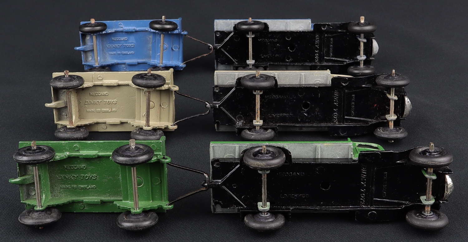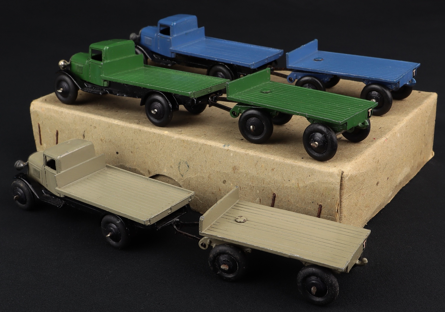 This Dinky Trade Box contains 3 x Dinky Toys 25T Flat Truck & Trailers in various colour issues, Type 3 issues. Smooth original tyres. Tinplate headlight and radiator assembly.